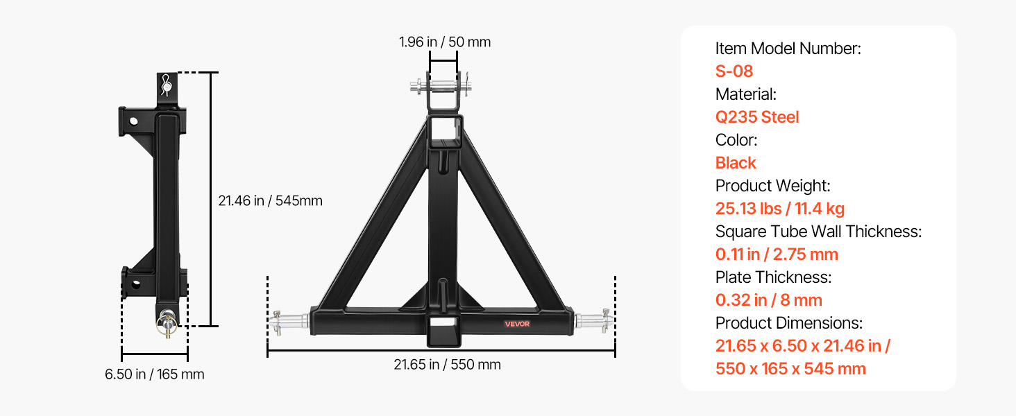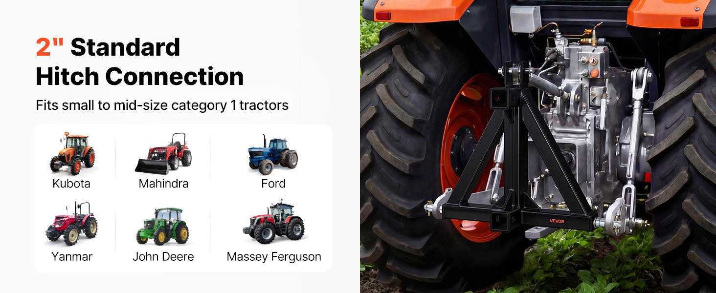 Tento 3-bodový záves s štandardným 2-palcovým pripojením je kompatibilný s širokou škálou traktorov kategórie 1. Podporuje modely populárnych značiek, ako sú Kubota, Mahindra, Ford, Yanmar, John Deere a Massey Ferguson.