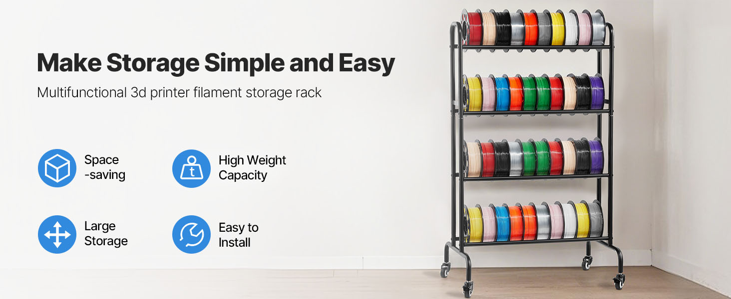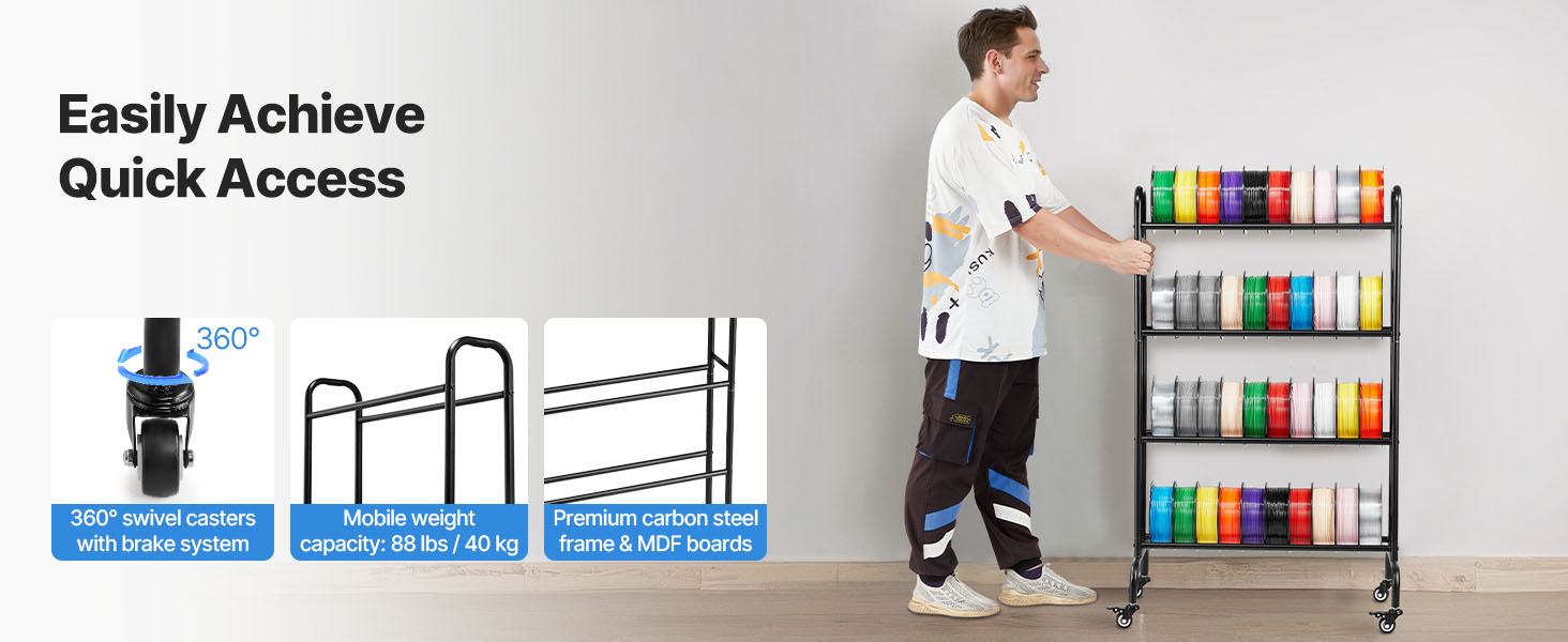 Tento regál na filamenty je vybavený 360° otočnými kolieskami s brzdovým systémom, ktoré umožňujú jednoduchý pohyb a bezpečné umiestnenie. Jeho robustný rám z uhlíkovej ocele a doska MDF unesú až 88 libier / 40 kg, takže prístup k vašim predmetom je bezproblémový a pohodlný!