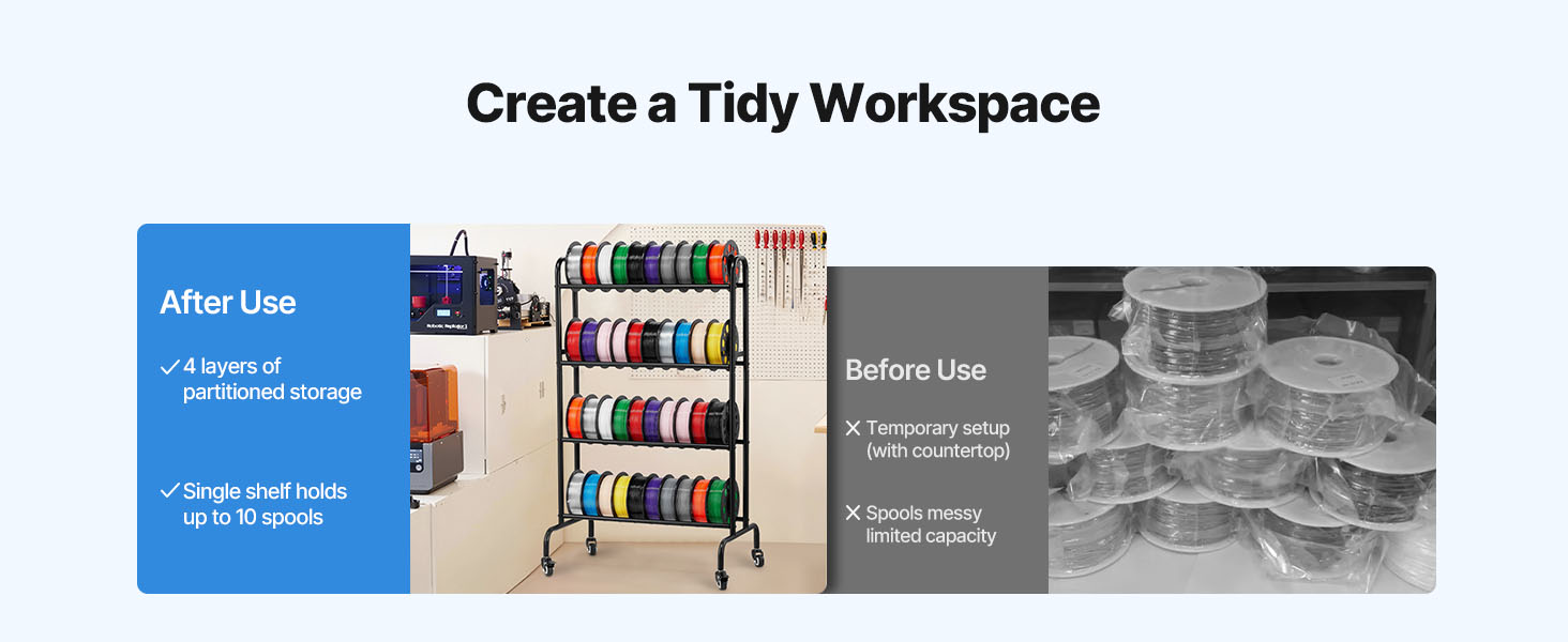 Ideálny pre akýkoľvek priestor! Či už ide o dielňu, kanceláriu alebo tlačiareň, tento stojan na 3D tlač sa prispôsobí akémukoľvek prostrediu. Je všestranný, ľahko a prakticky spĺňa potreby skladovania v rôznych prostrediach.