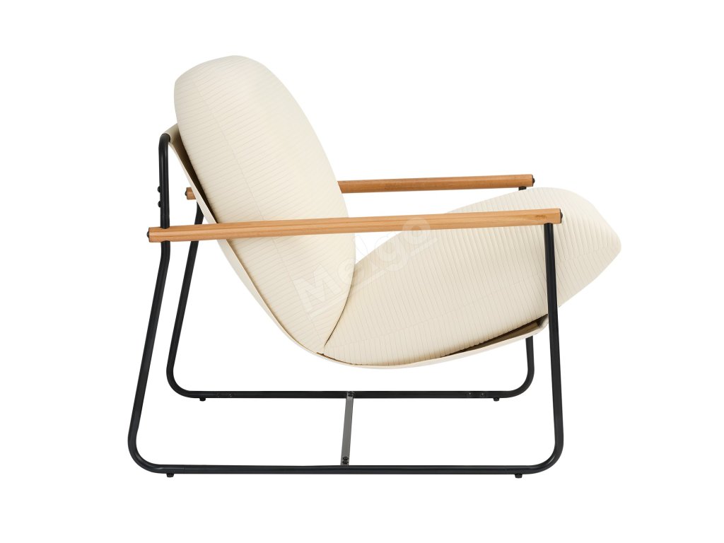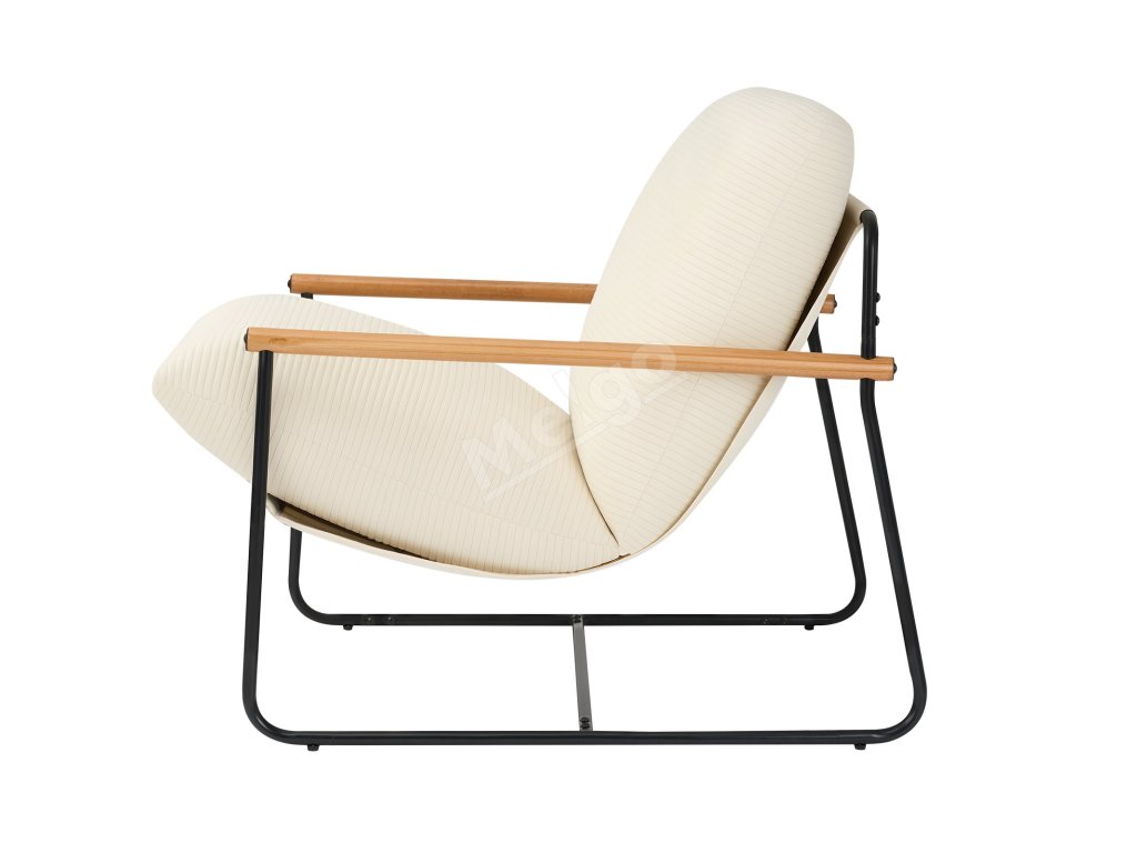 Čalúnené kreslo s kovovým rámom a drevenými opierkami, béžové s vankúšom