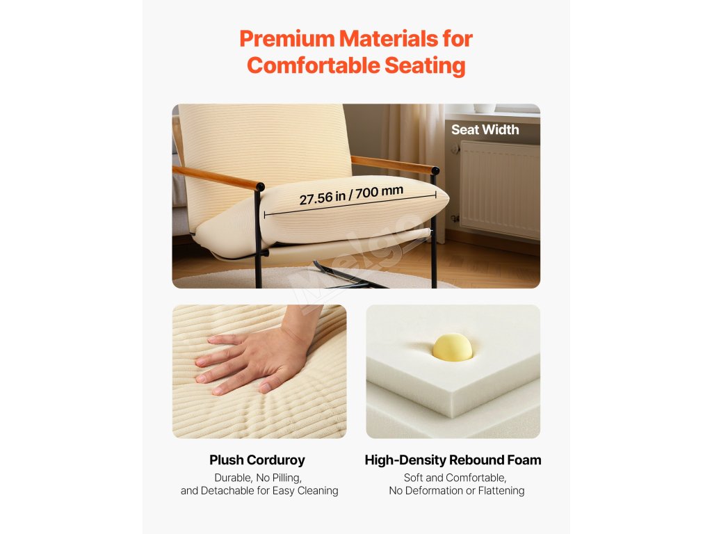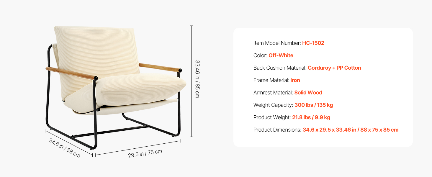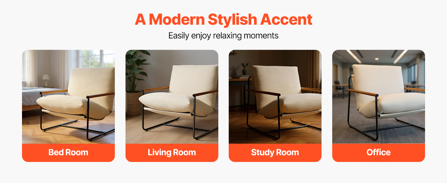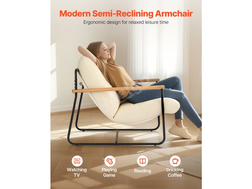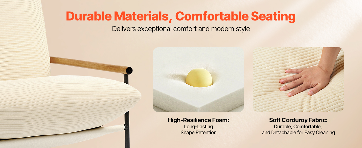 Sedadlo a operadlo vyplnené prvotriednou penou s vysokou hustotou a s ergonomickým pololežiacim dizajnom sa prispôsobujú prirodzeným krivkám tela a poskytujú pevnú bedrovú oporu. Toto akcentové kreslo čalúnené mäkkým, hladkým manšestrom poskytuje útulný dotyk a štýlový vzhľad pre každý moderný priestor.