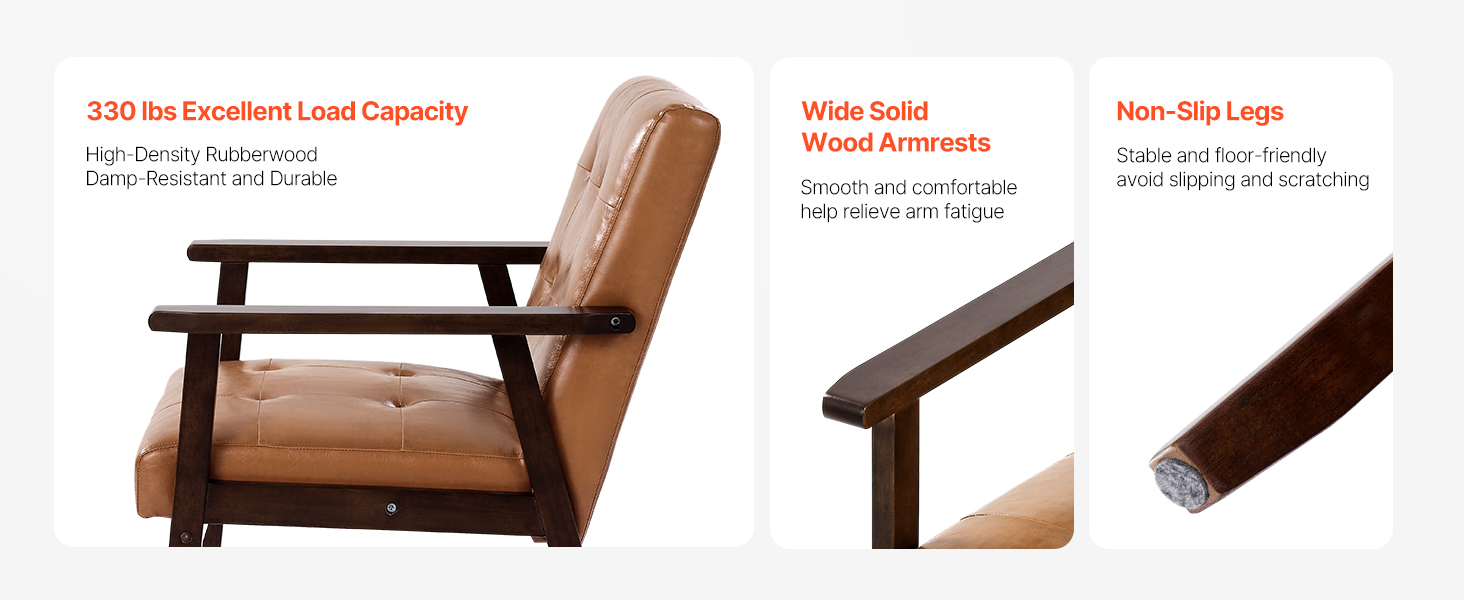Toto akcentové kreslo je vyrobené zo zhrubnutého masívneho dreva, ktoré unesie až 330 kg. Hladký povrch je bez otrepov a ergonomické podrúčky poskytujú oporu rúk pri práci alebo odpočinku. Podložky pod nohy zaisťujú stabilitu a pomáhajú predchádzať poškodeniu podlahy.