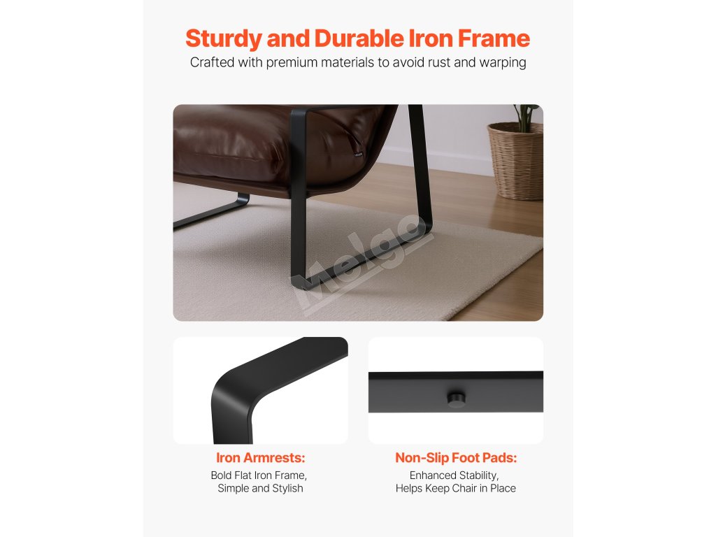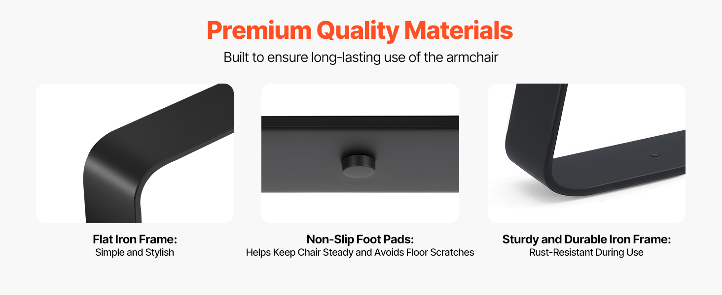 Táto moderná stolička, skonštruovaná s pevným železným rámom, ktorý je odolný voči korózii a deformáciám, unesie až 300 libier/135 kg. Protišmykové podložky na nohách zvyšujú stabilitu a chránia vašu podlahu pred poškriabaním alebo pošmyknutím.