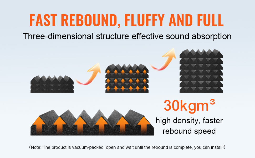 K dispozícii sú jedinečné tvary klinu, pyramídy a vajíčka, ktoré si môžete vybrať podľa svojho priestoru. Textúrovaný povrch zväčšuje plochu peny, čím účinne pohlcuje zvukové vlny na lepšiu zvukovú izoláciu.