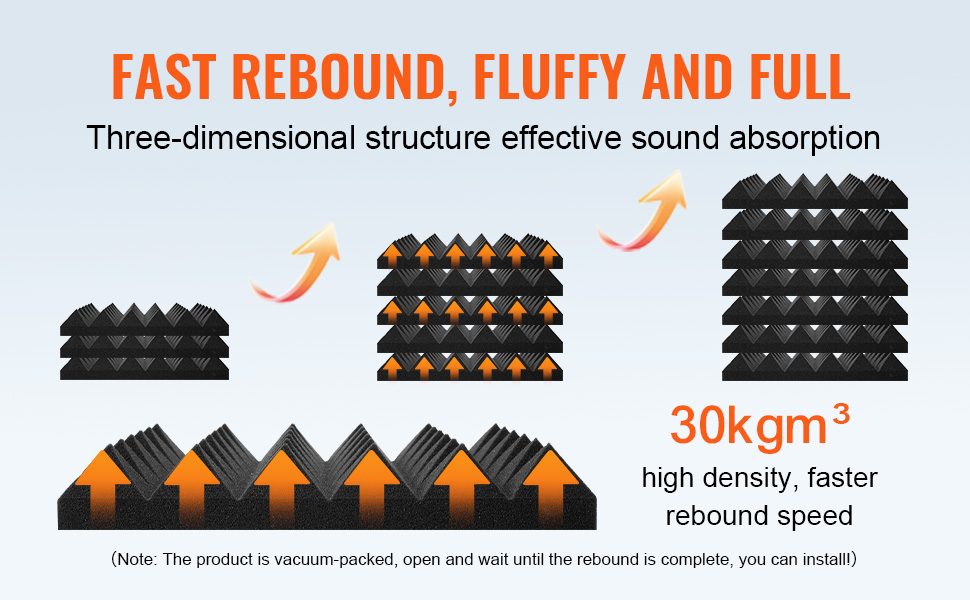 K dispozícii sú jedinečné tvary klinu, pyramídy a vajíčka, ktoré si môžete vybrať podľa svojho priestoru. Textúrovaný povrch zväčšuje plochu peny, čím účinne pohlcuje zvukové vlny na lepšiu zvukovú izoláciu.