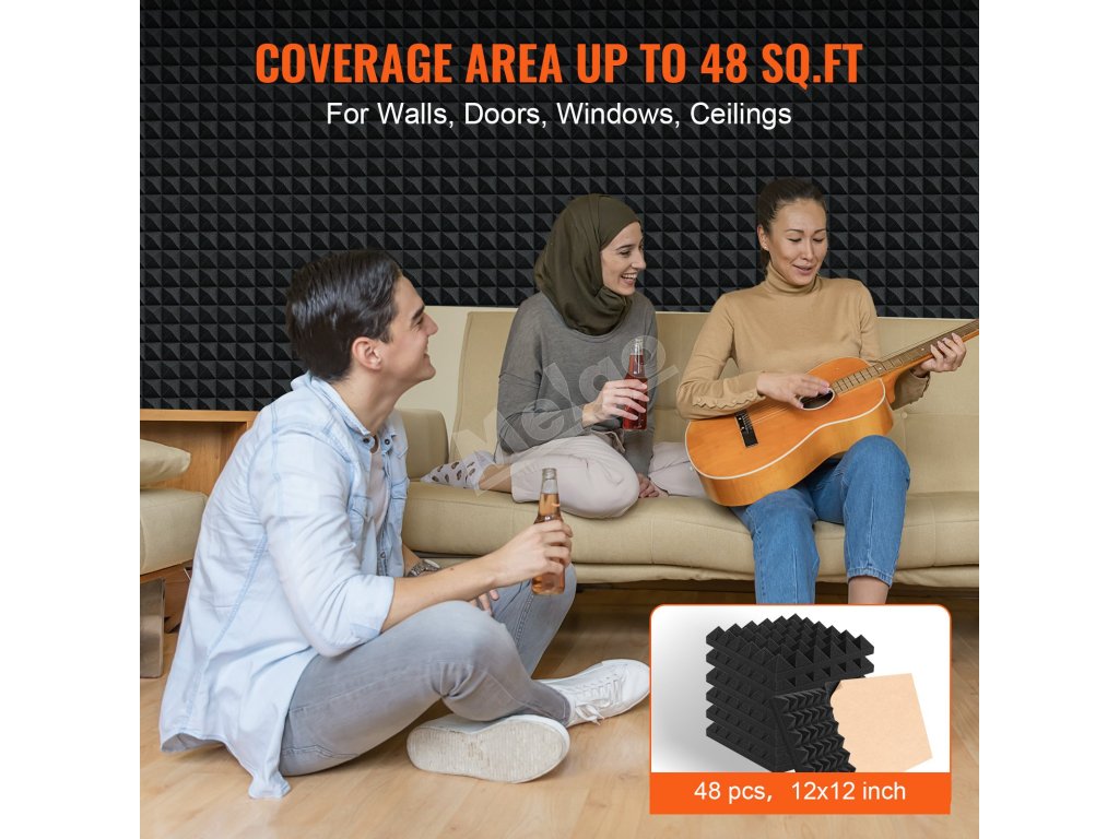 Akustické penové panely 48 ks 12×12×2 inches lepiace pyramídové čierne