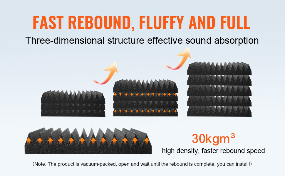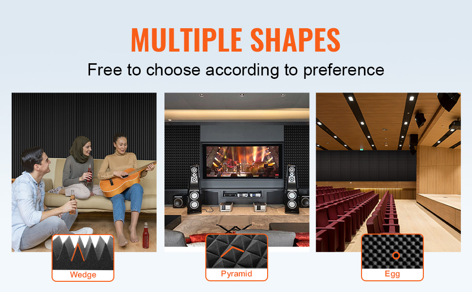 K dispozícii sú jedinečné tvary klinu, pyramídy a vajíčka, ktoré si môžete vybrať podľa svojho priestoru. Textúrovaný povrch zväčšuje plochu peny, čím účinne pohlcuje zvukové vlny na lepšiu zvukovú izoláciu.