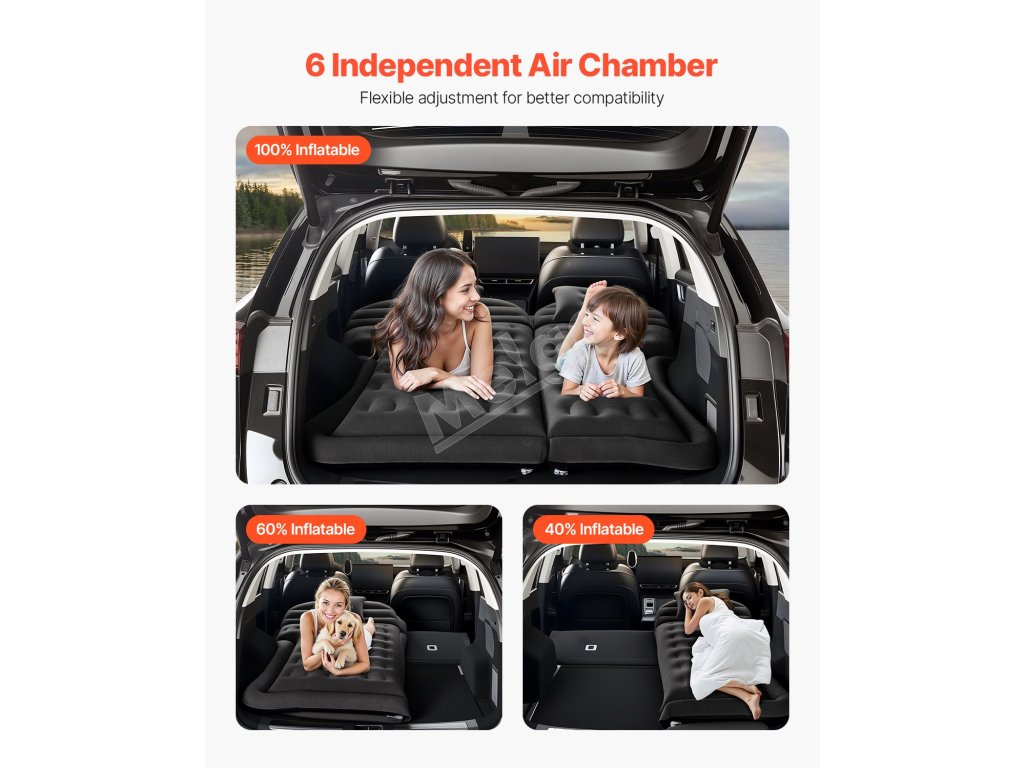 Nafukovací matrac je rozdelený na 6 nezávislých vzduchových komôr. Môžete si vybrať, či chcete matrac úplne nafúknuť pre viacerých používateľov, alebo ho upraviť podľa dostupného priestoru v kufri auta.
