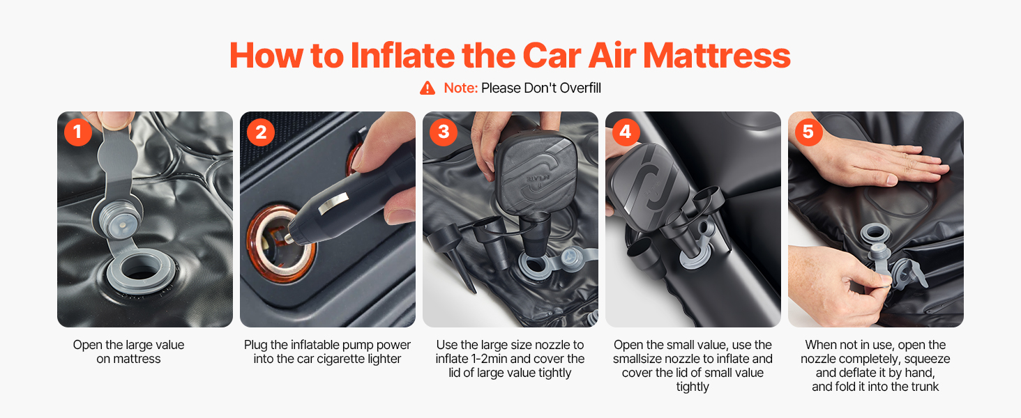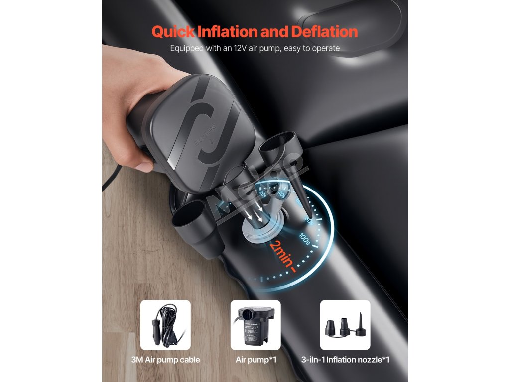Nafúknutie nafukovacieho kempingového matraca do auta trvá len 2 minúty, čo vám umožní rýchlo ho začať používať. Matrac je vybavený externou vzduchovou pumpou a tryskou tri v jednom na jednoduchú obsluhu. Vzduchová pumpa je vybavená 3 metre dlhým káblom, ktorý umožňuje nafukovanie na veľké vzdialenosti.