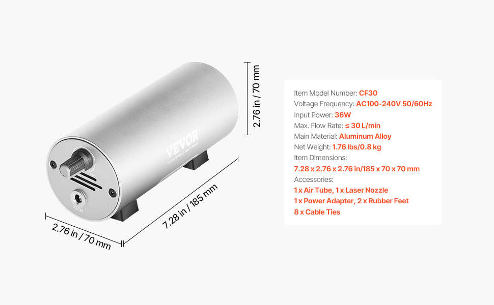 Toto vzduchové čerpadlo ľahko odfúkne dym a nečistoty, čím predĺži životnosť vášho laserového modulu. Nastaviteľný prietok vzduchu 30 l/min znižuje povrchovú teplotu, zabezpečuje čistý rezný okraj. Kompatibilné s gravírovacími strojmi VEVOR a inými značkami ≥ 20 W. Vhodný na všetky vaše gravírovacie práce.