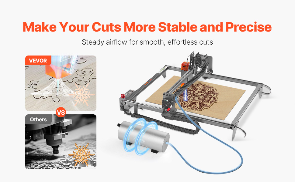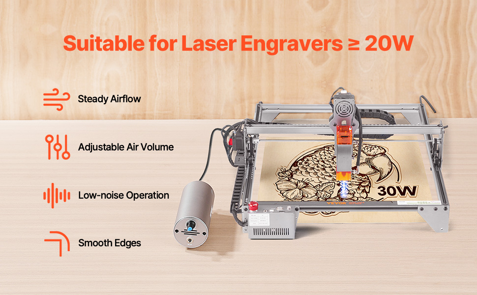 Tento vzduchový asistent laserového gravírovacieho zariadenia zvyšuje potenciál vášho laserového gravírovacieho zariadenia vďaka konzistentnému prietoku vzduchu a presnosti rezania, čím zabezpečuje bezchybný povrch a krásne hladké hrany.