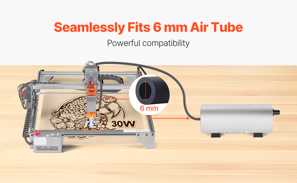 Náš vzduchový asistent pre laserovú rezačku má výkonnú kompatibilitu zabezpečuje bezpečné pripojenie so 6 mm vzduchovou trubicou, čím poskytuje konzistentný prietok vzduchu na riešenie celého radu úloh laserového rezania a gravírovania.