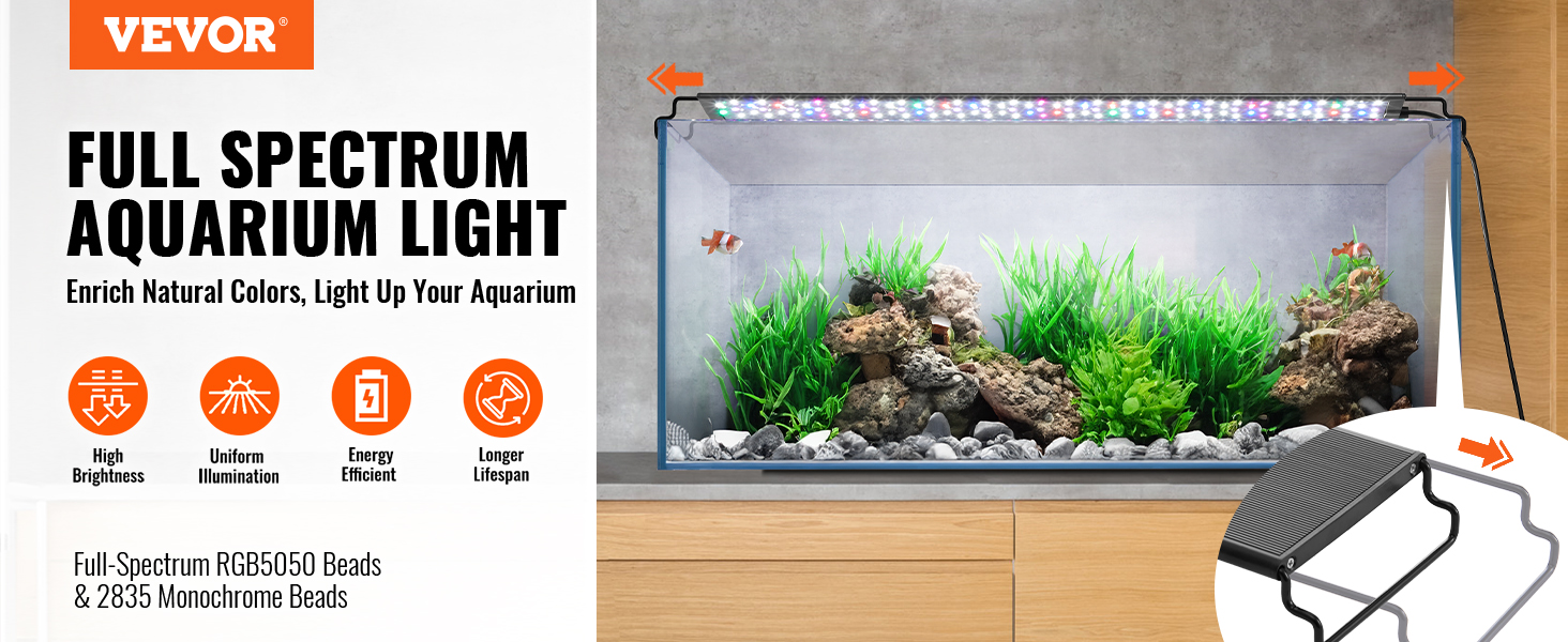 Prebuďte farby a objavte krásu prírody. Akváriové svetlo VEVOR je vybavené vysoko svietivými diódami RGB5050 s plným spektrom a 2835 monochromatickými diódami LED, ktoré poskytujú živé a rovnomerné osvetlenie a zároveň šetria energiu, zabezpečujú dlhú životnosť a zlepšujú atmosféru vodného prostredia.