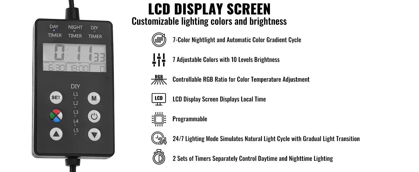 LCD monitor zobrazuje miestny čas. Môžete nastaviť farby, jas a pomery RGB a vytvoriť tak dokonalé osvetlenie akvária. Cykly prirodzeného svetla 24 hodín denne, 7 dní v týždni spolu s 2 sadami časovačov pre denné a nočné osvetlenie umožňujú jednoduchú správu vášho akvária.