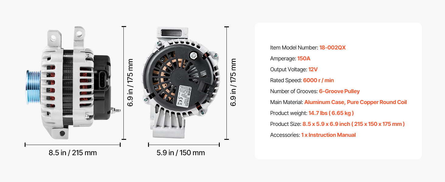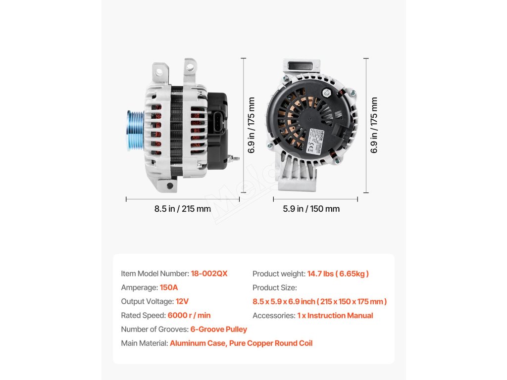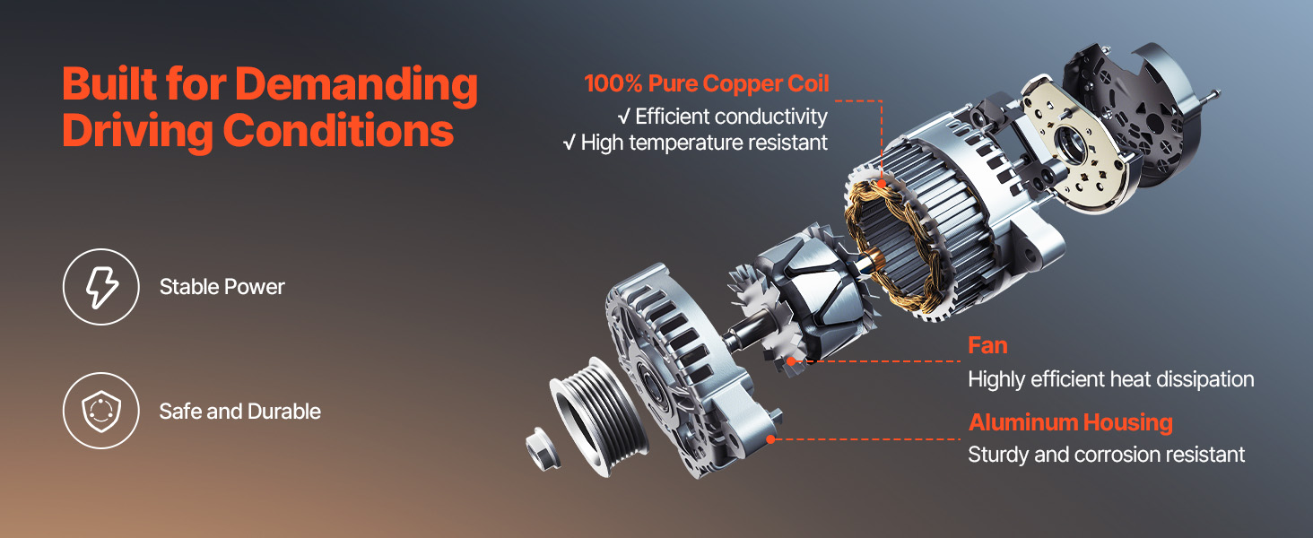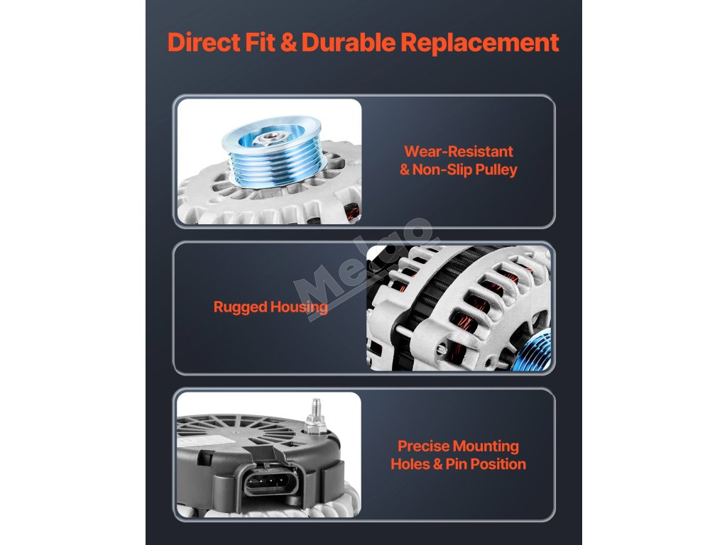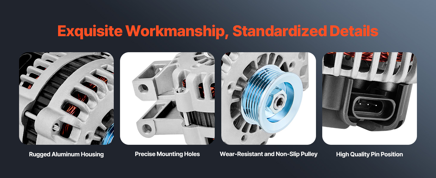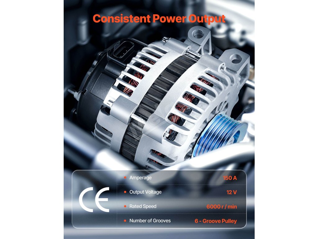 Náš náhradný alternátor je vybavený cievkami z čistej medi pre lepšiu životnosť ako hliník. Hliníkový kryt a chladiaci ventilátor zvyšujú odvod tepla. Poskytuje stabilný výstup 150 A na podporu zariadení s vysokým zaťažením, ako sú striedavé a prémiové zvukové systémy.