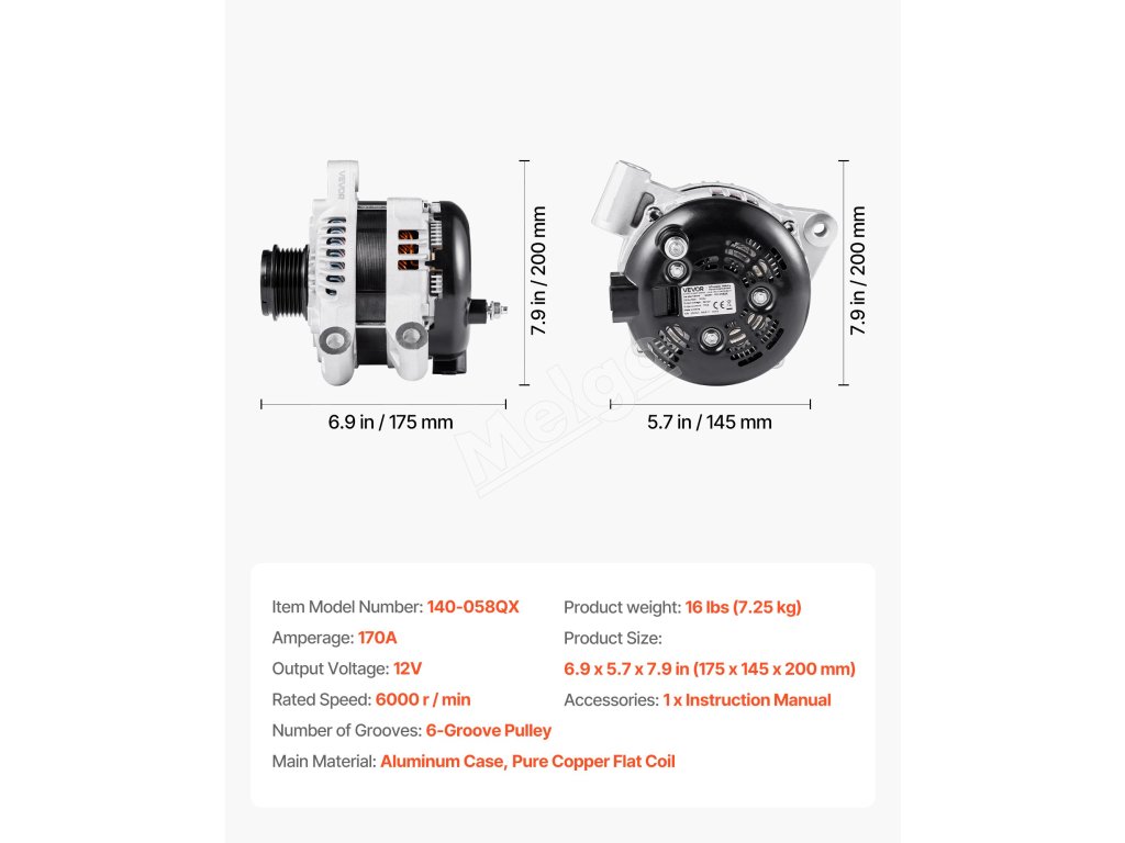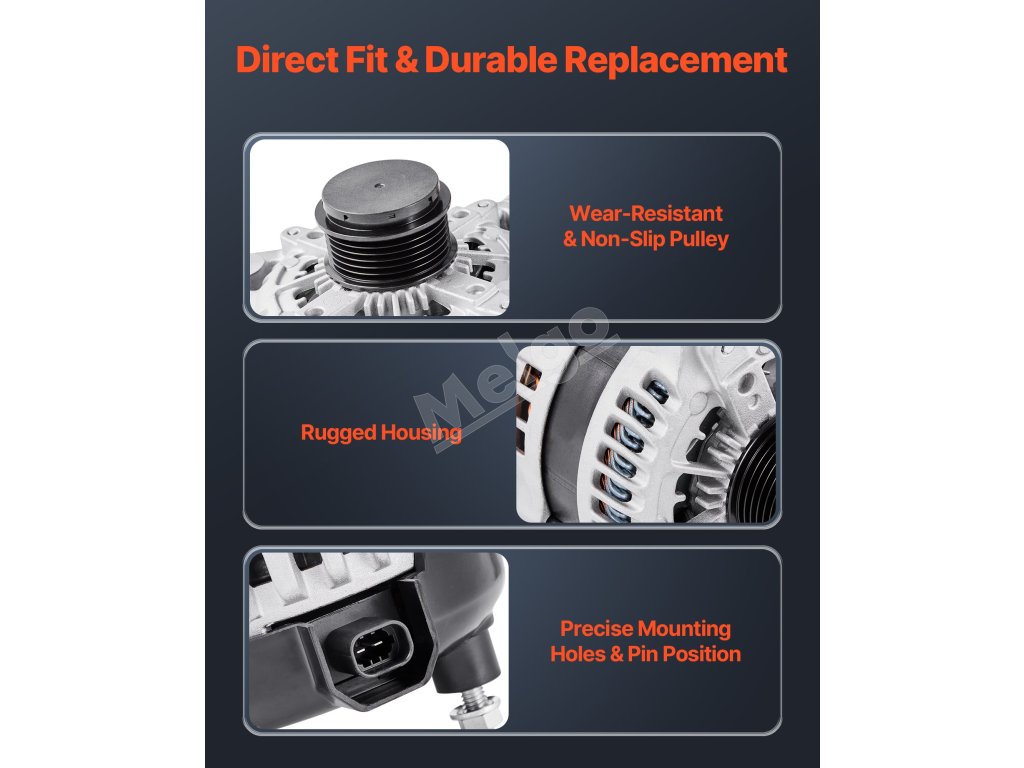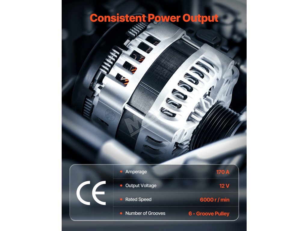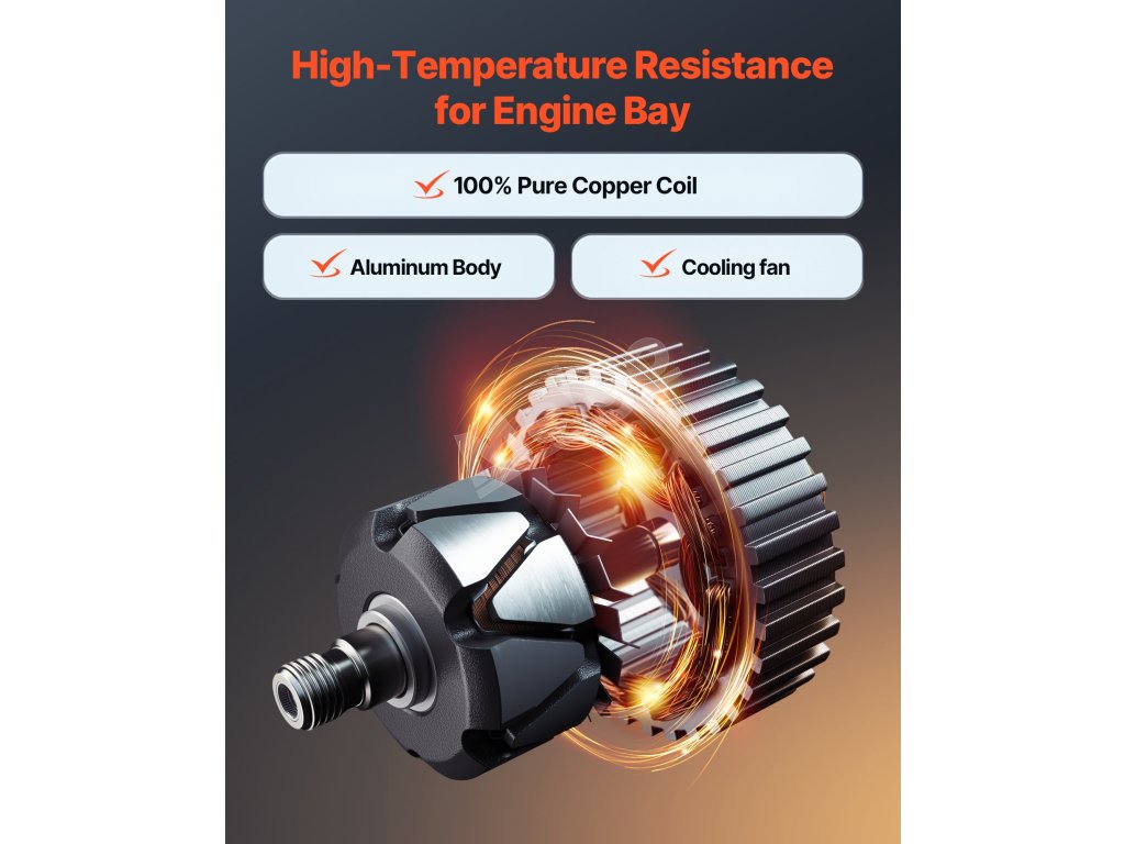 Náš náhradný alternátor je vybavený cievkami z čistej medi pre lepšiu životnosť ako hliník. Hliníkový kryt a chladiaci ventilátor zvyšujú odvod tepla. Poskytuje stabilný výstup 170 A na podporu zariadení s vysokým zaťažením, ako sú klimatizácia a prémiové zvukové systémy.