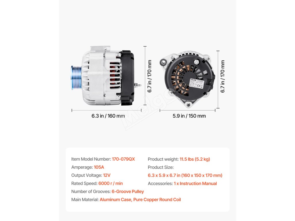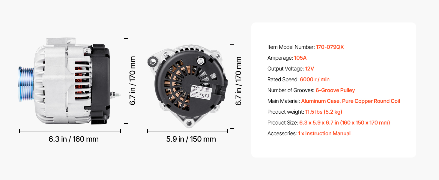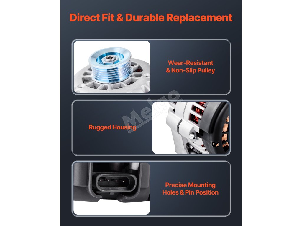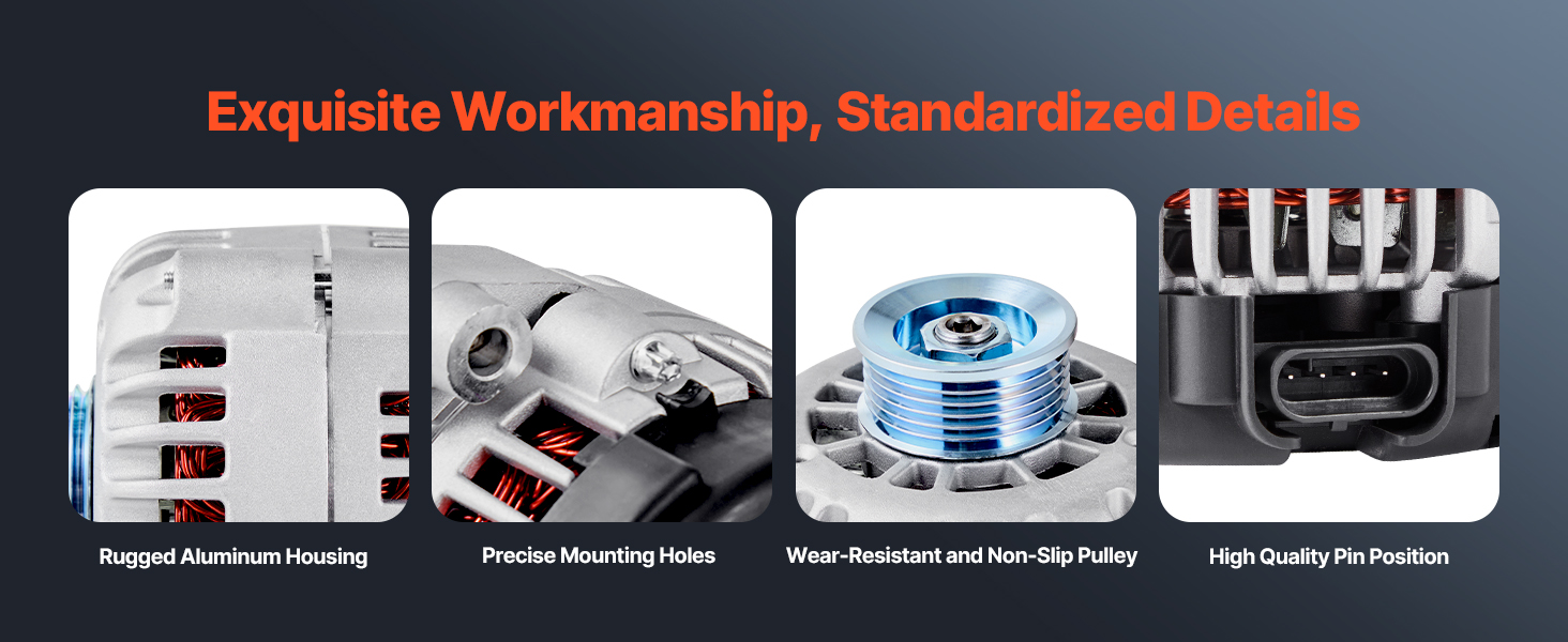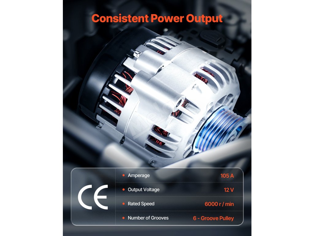 Náš náhradný alternátor je vybavený cievkami z čistej medi pre lepšiu životnosť ako hliník. Hliníkový kryt a chladiaci ventilátor zvyšujú odvod tepla. Poskytuje stabilný výstup 105 A na podporu vysoko zaťažených zariadení, ako sú klimatizácia a prémiové zvukové systémy.