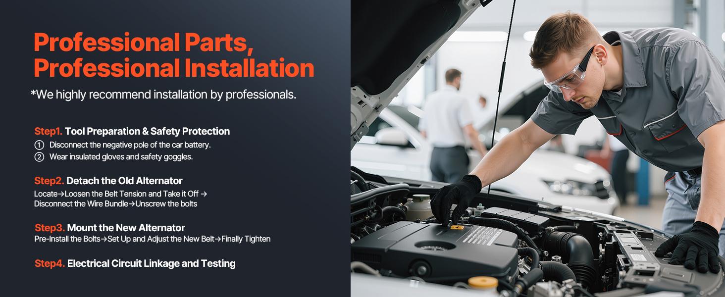 Alternátor s vysokým výkonom nevyžaduje na inštaláciu žiadne rezanie ani vŕtanie. Ak je však systém počas demontáže alebo inštalácie napájaný, nezabudnite izolovať kladné a záporné svorky.