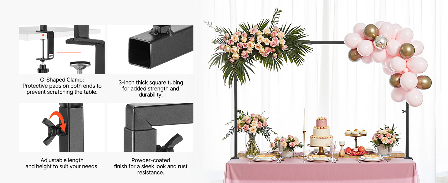 Tento robustný stojan na stolové tyče udrží dekorácie do hmotnosti 10 - 20 libier (4,5 kg - 9,1 kg) bez toho, aby sa prevrátili. Vďaka trom nastaviteľným výškam sa hodí na rôzne veľkosti stolov a je vhodný na svadby, narodeniny a iné podujatia. Kompletné príslušenstvo a úložná taška na jednoduché skladovanie, prepravu a ochranu.