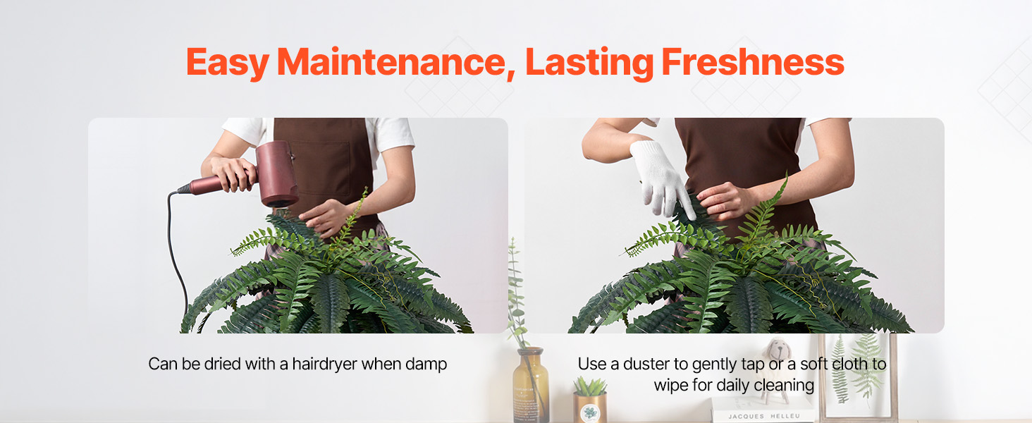V prípade dažďa ju jednoducho vysušte fénom. Na udržanie sviežeho vzhľadu tejto umelej vonkajšej rastliny stačí pravidelné čistenie prachovkou alebo mäkkou handričkou.