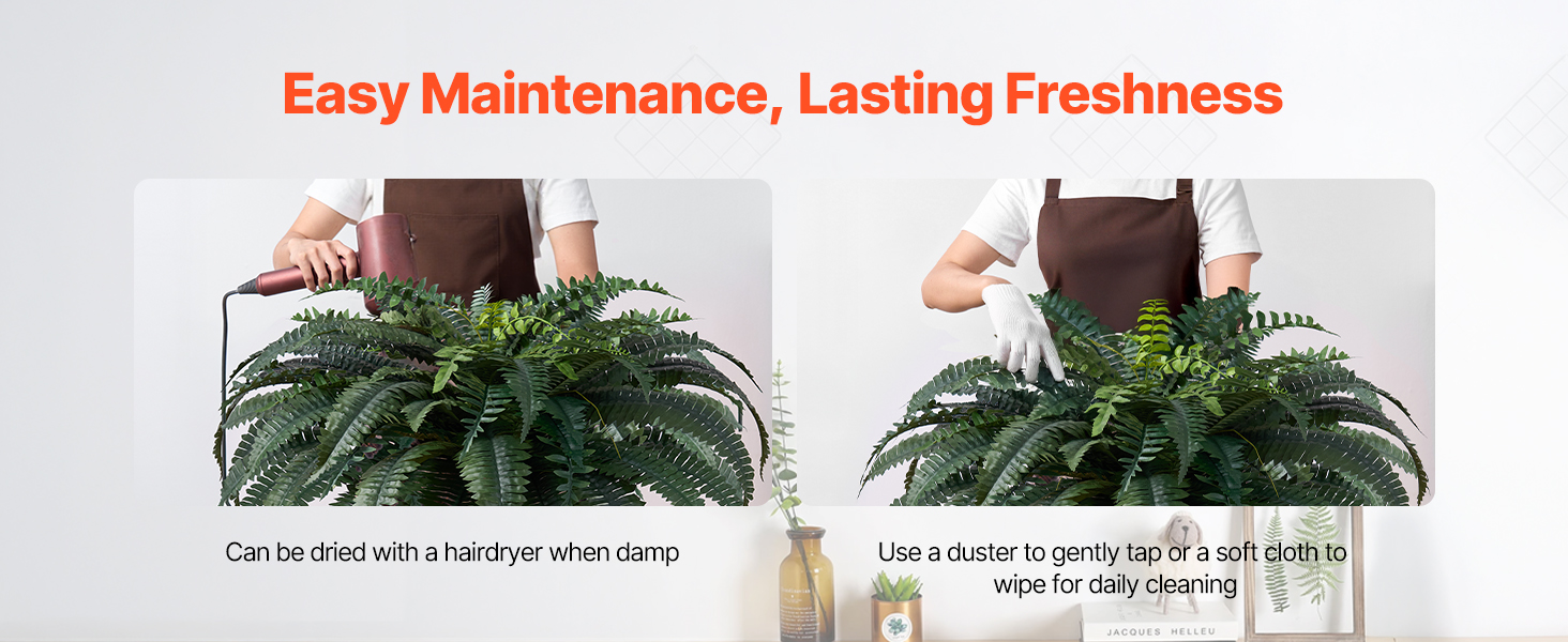 V prípade dažďa ju jednoducho vysušte fénom. Na udržanie sviežeho vzhľadu tejto umelej vonkajšej rastliny stačí pravidelné čistenie prachovkou alebo mäkkou handričkou.