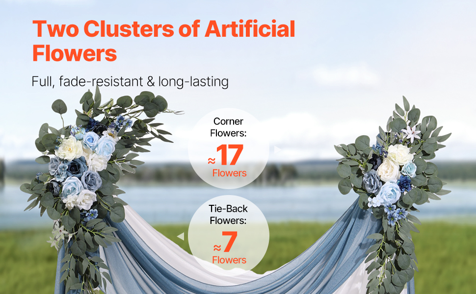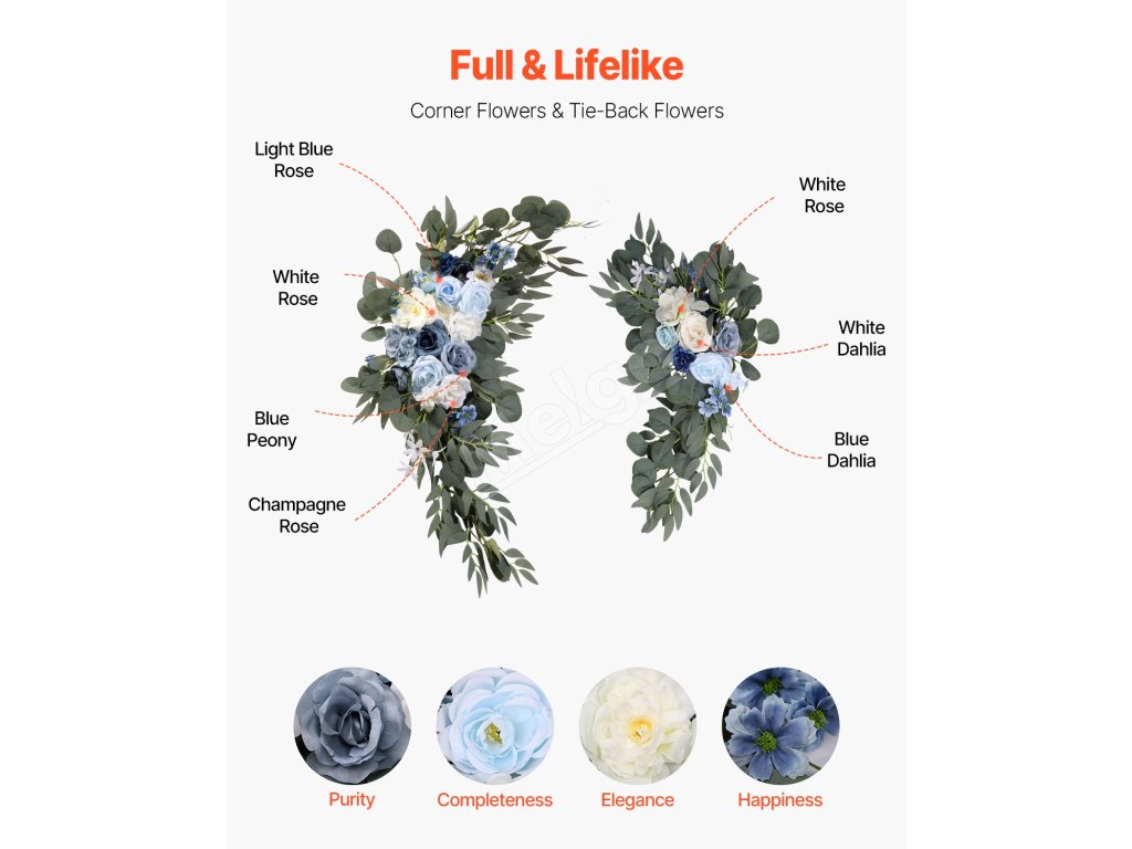 Táto súprava kvetov a závesov na svadobný oblúk obsahuje 2 trsy umelých kvetov, pričom každý kvet je plný a realistický, živý a odolný voči vyblednutiu. Sú neuveriteľne krásne a dajú sa používať dlhodobo alebo opakovane používať na budúce oslavy.