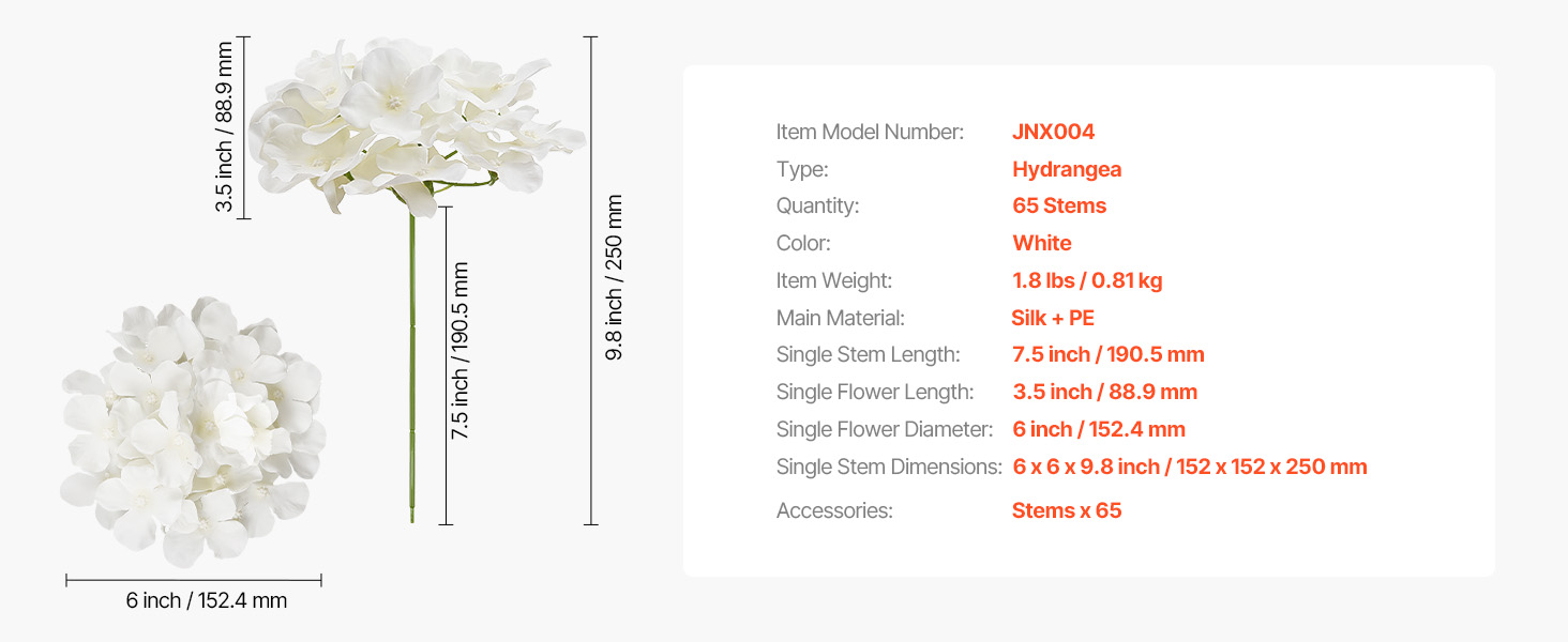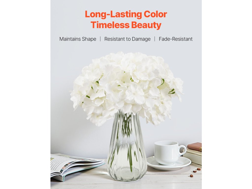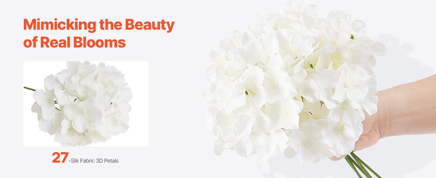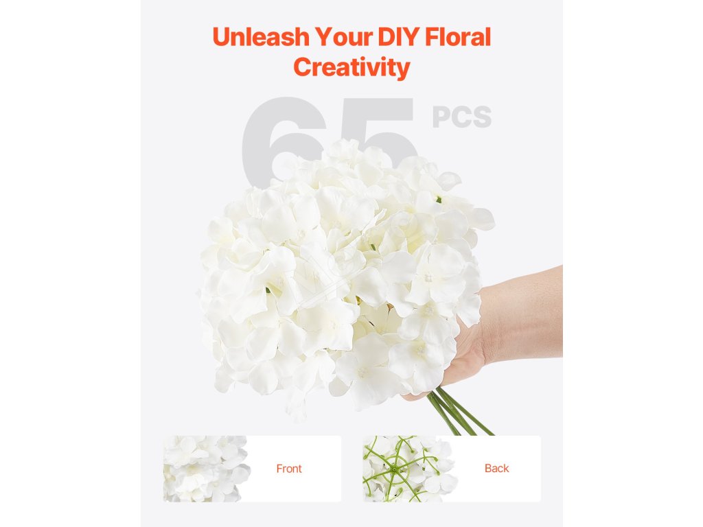 Sada obsahuje 65 bielych umelých hortenzií, z ktorých každá má 27 okvetných lístkov pre realistický kvet. Kvety sú 9,8" vysoké so 6" hlavami, vyrobené z hodvábu, ktorý nevybledne. Ohybné stonky umožňujú jednoduché ohýbanie a zastrihávanie pre domácich majstrov. Nenáročné na údržbu - stačí oprášiť, aby boli krásne. Ideálne na svadby, večierky a domáce dekorácie.