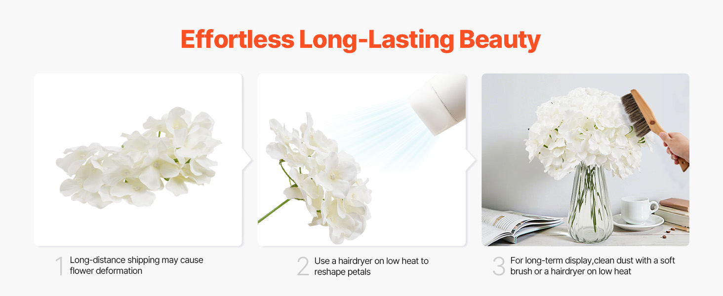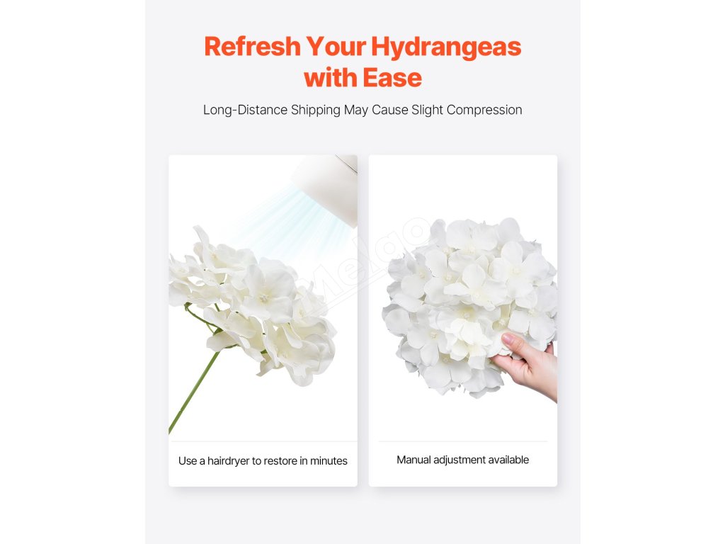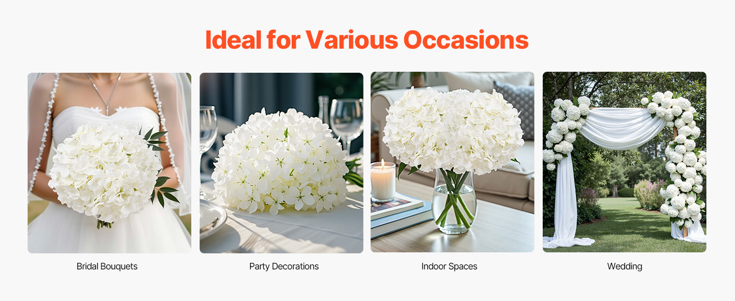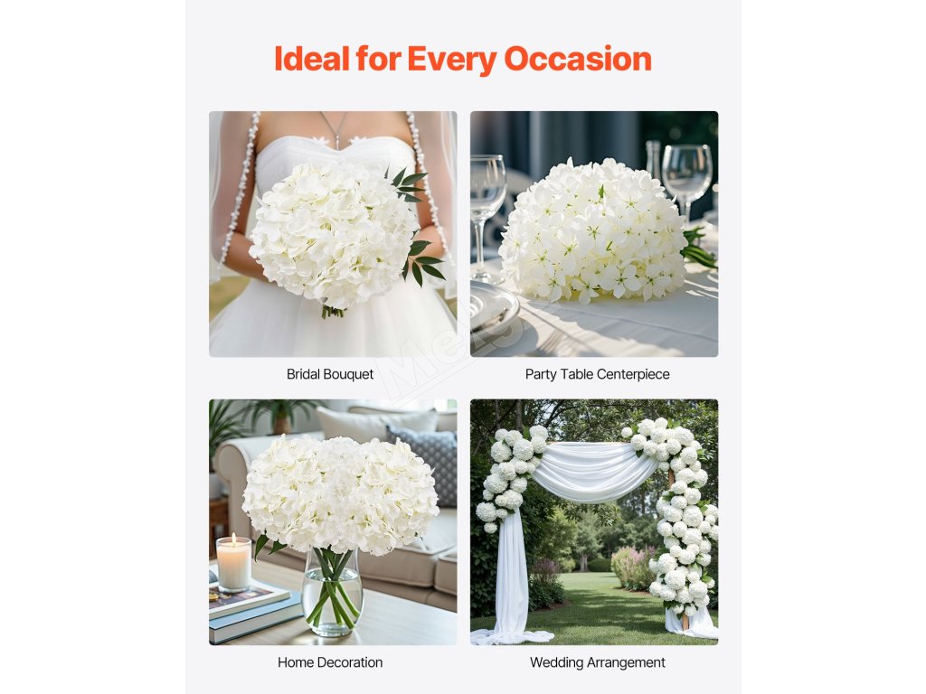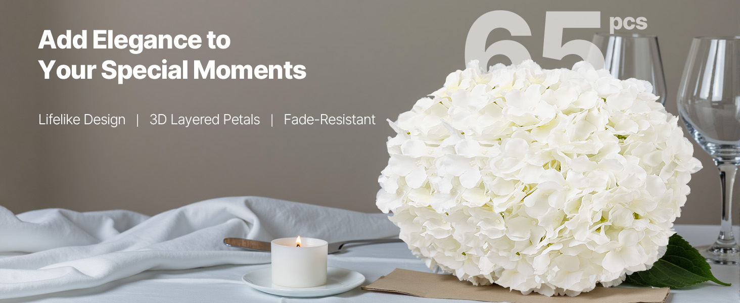 Sada obsahuje 65 bielych umelých hortenzií, z ktorých každá má 27 okvetných lístkov pre realistický kvet. Kvety sú 9,8" vysoké so 6" hlavami, vyrobené z hodvábu, ktorý nevybledne. Ohybné stonky umožňujú jednoduché ohýbanie a zastrihávanie pre domácich majstrov. Nenáročné na údržbu - stačí oprášiť, aby boli krásne. Ideálne na svadby, večierky a domáce dekorácie.
