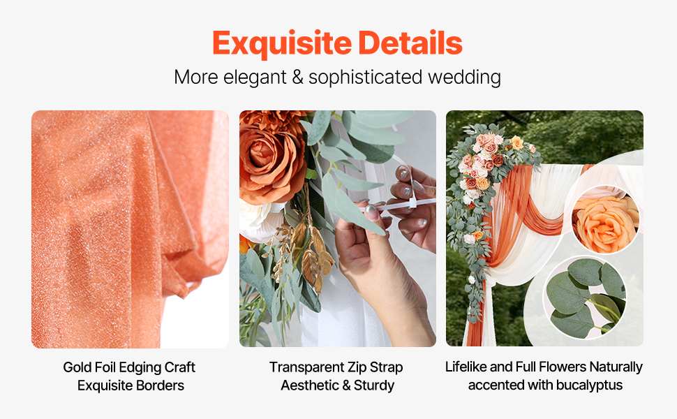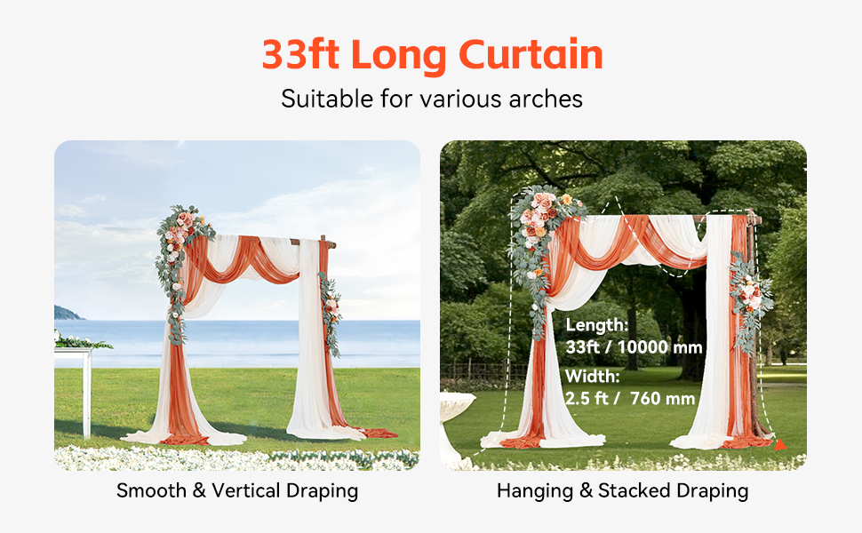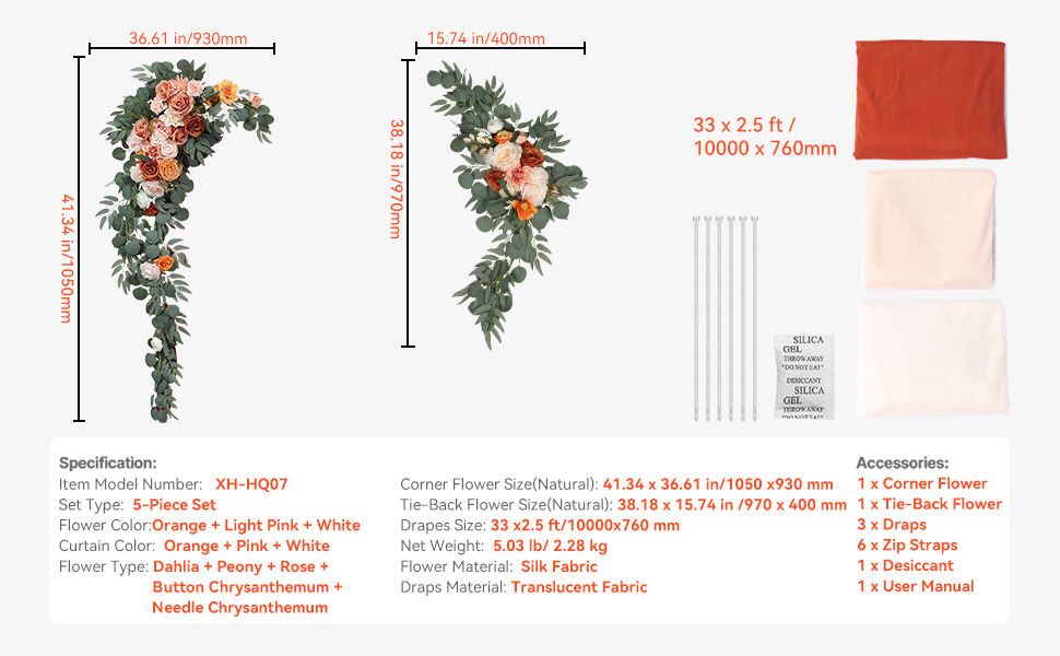 Záves tejto súpravy umelých kvetov na svadobný oblúk s dĺžkou 33 stôp možno zavesiť alebo prevesiť a vytvoriť tak na mieste konania podujatia vrstvy romantiky. Slúži aj ako všestranný dekoratívny prvok, ktorý dodá eleganciu akémukoľvek prostrediu