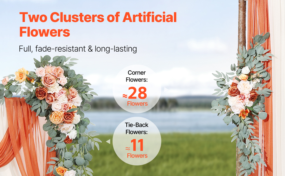 Táto súprava kvetov a závesov na svadobný oblúk obsahuje 2 trsy umelých kvetov, pričom každý kvet je plný a realistický, živý a odolný voči vyblednutiu. Sú neuveriteľne krásne a dajú sa používať dlhodobo alebo opakovane používať na budúce oslavy.