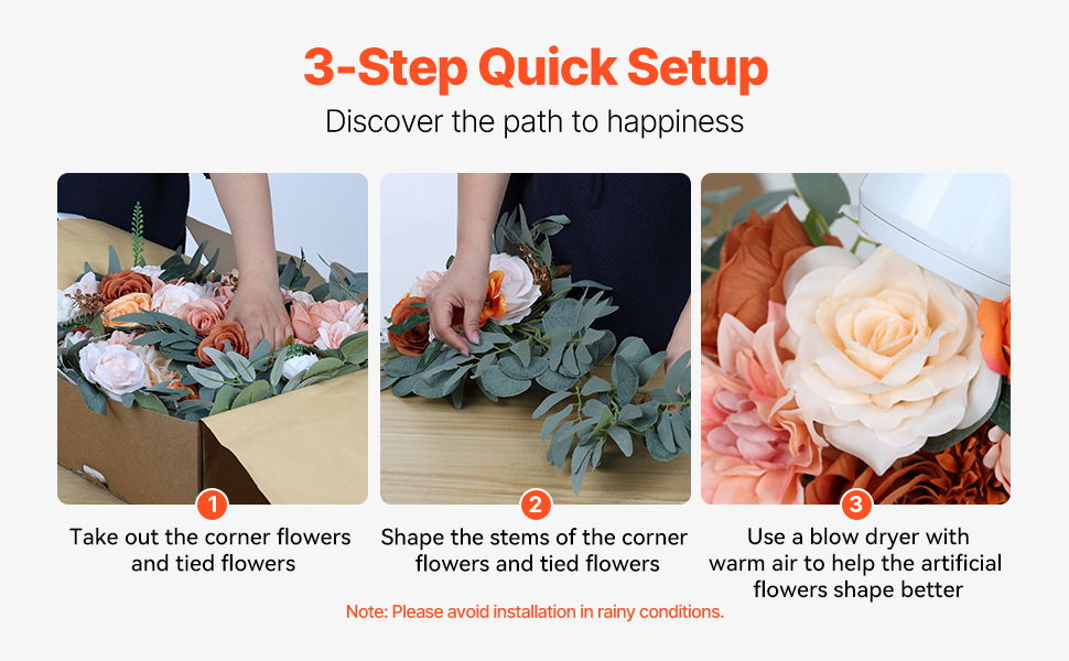 Jednoducho vytvarujte rohové kvety a kvety s viazaním, potom použite sušič vlasov, aby ste pomohli umelým kvetom nadobudnúť tvar. Pre dosiahnutie najlepších výsledkov sa vyhnite nastavovaniu v daždivých podmienkach. Toto aranžovanie kvetinového oblúka sa rýchlo a jednoducho inštaluje, takže si môžete vychutnať nastavenie bez stresu.