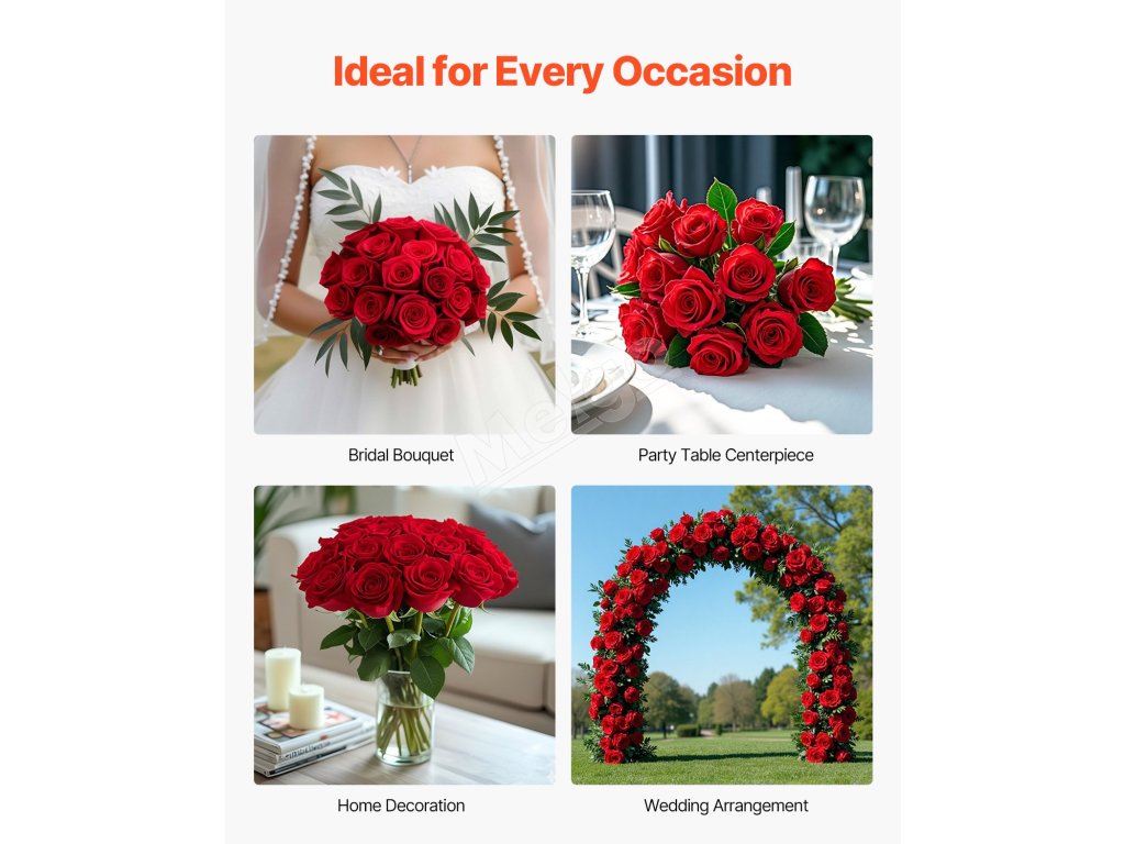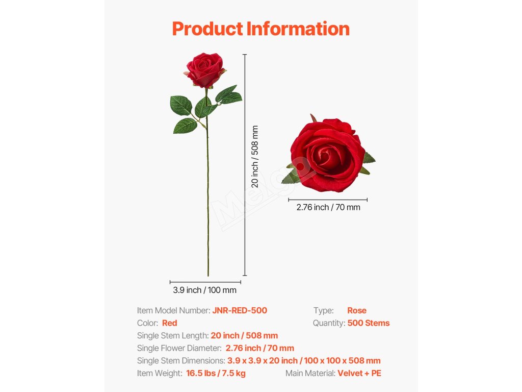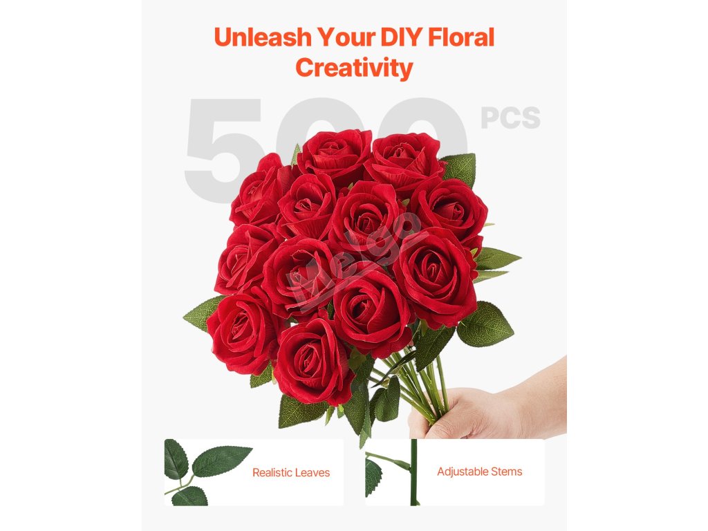 Sada obsahuje 500 umelých ruží s 5-vrstvovými okvetnými lístkami pre realistický vzhľad. Každá ruža je 20" vysoká s 2,76" hlavou a je vyrobená z flokovej tkaniny odolnej proti vyblednutiu. Ohybné stonky umožňujú jednoduché ohýbanie a zastrihávanie pre domácich majstrov. Nenáročná údržba - na udržanie sviežosti stačí oprášiť. Ideálne na svadby, večierky a domáce dekorácie.