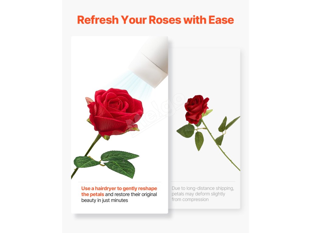 Naše umelé ruže majú ohybné stonky z plastu a drôtu, ktoré umožňujú ohýbanie alebo zastrihávanie na tvorivé kvetinové aranžmány.
