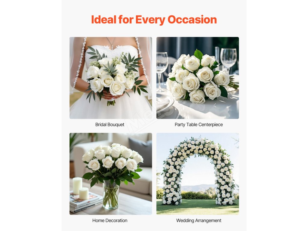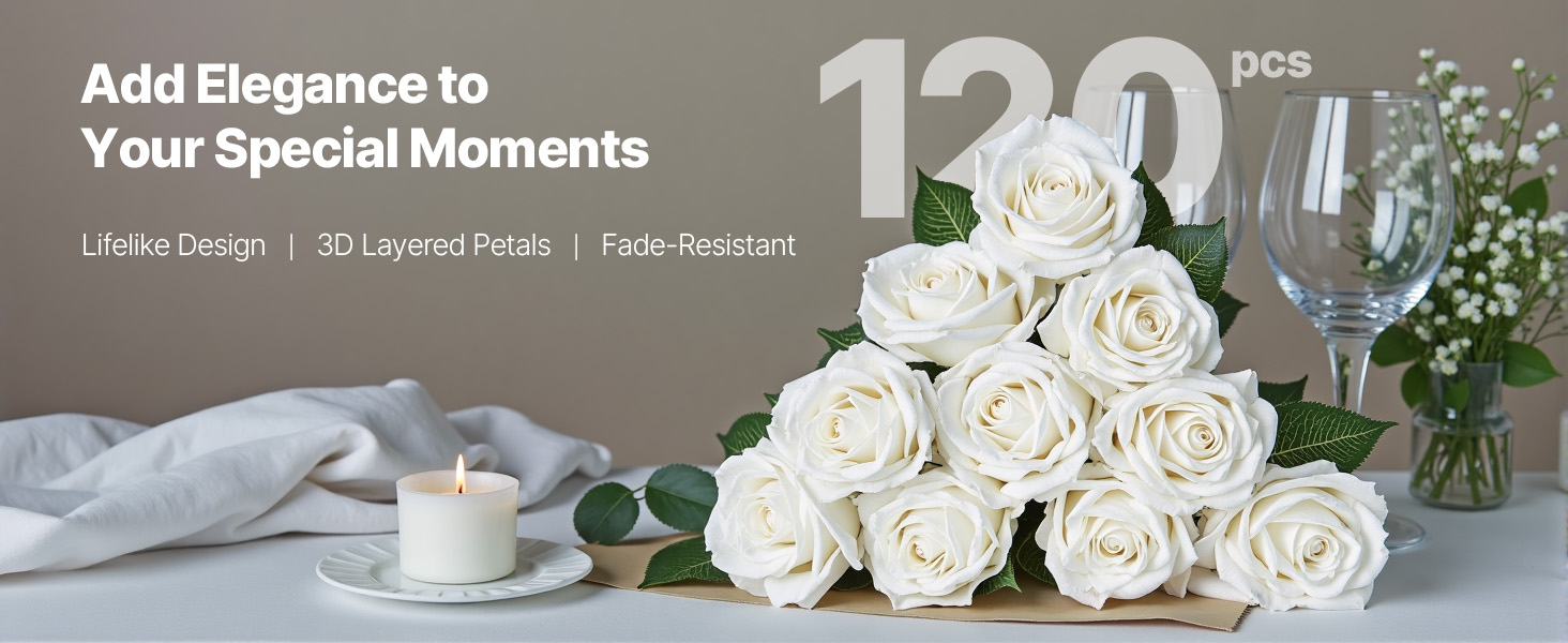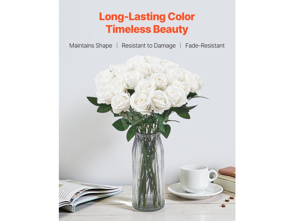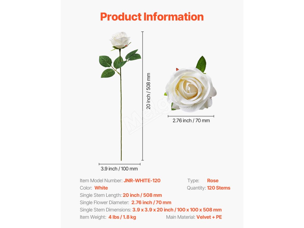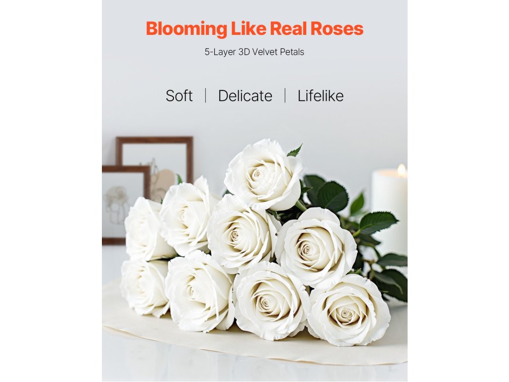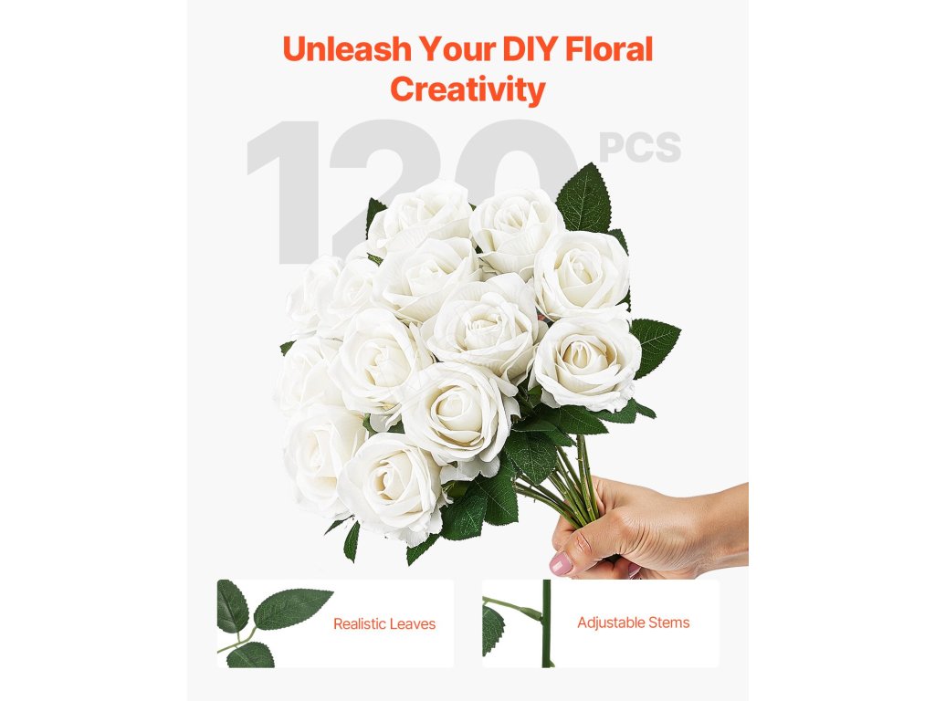 Sada obsahuje 120 umelých ruží s 5-vrstvovými okvetnými lístkami pre realistický vzhľad. Každá ruža je 20" vysoká s 2,76" hlavou a je vyrobená z flokovej tkaniny odolnej proti vyblednutiu. Ohybné stonky umožňujú jednoduché ohýbanie a zastrihávanie pre domácich majstrov. Nenáročná údržba - na udržanie sviežosti stačí oprášiť. Ideálne na svadby, večierky a domáce dekorácie.