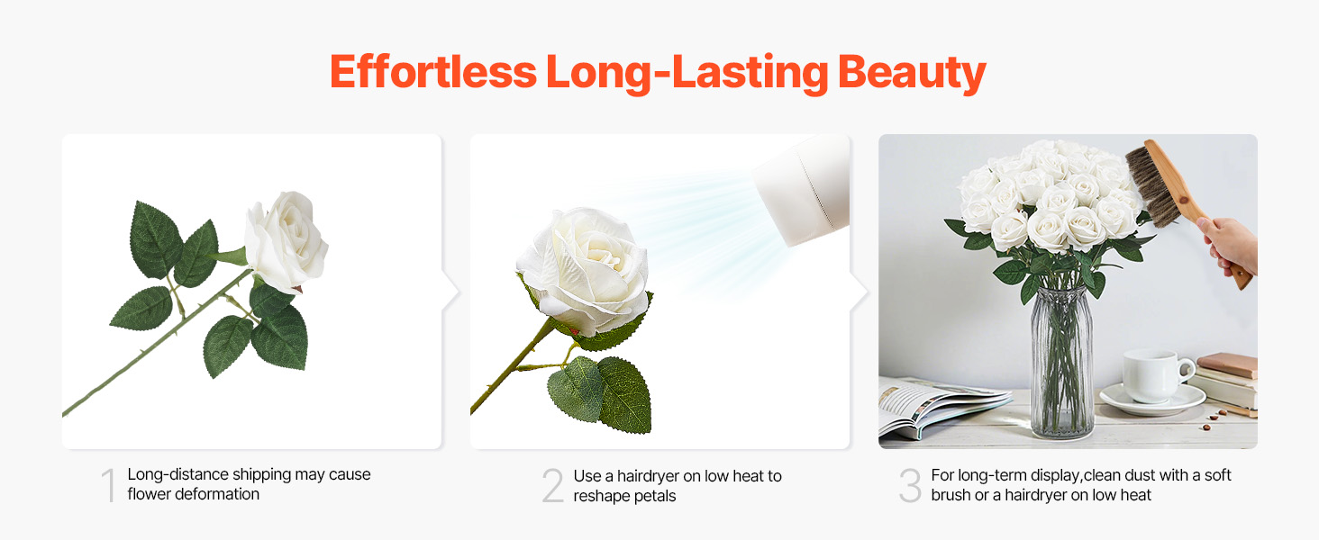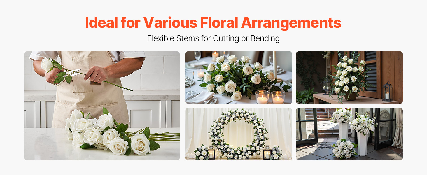 Naše umelé ruže majú ohybné stonky z plastu a drôtu, ktoré umožňujú ohýbanie alebo zastrihávanie na tvorivé kvetinové aranžmány.
