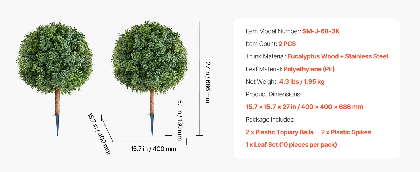 Umelé tvarované buxusové stromčeky, 2 ks, výška 686 mm, s kolíkom