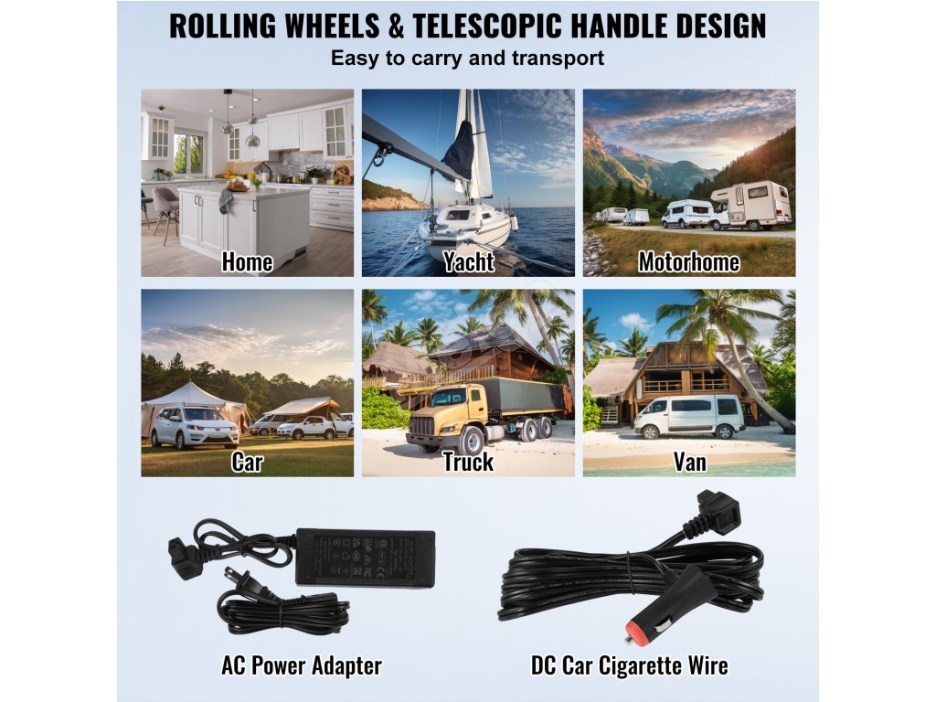 Vybavený adaptérom, káblom do cigaretového zapaľovača a sieťovým káblom, možno ho používať doma, na jachtách, obytných vozidlách, osobných a nákladných automobiloch a dodávkach.