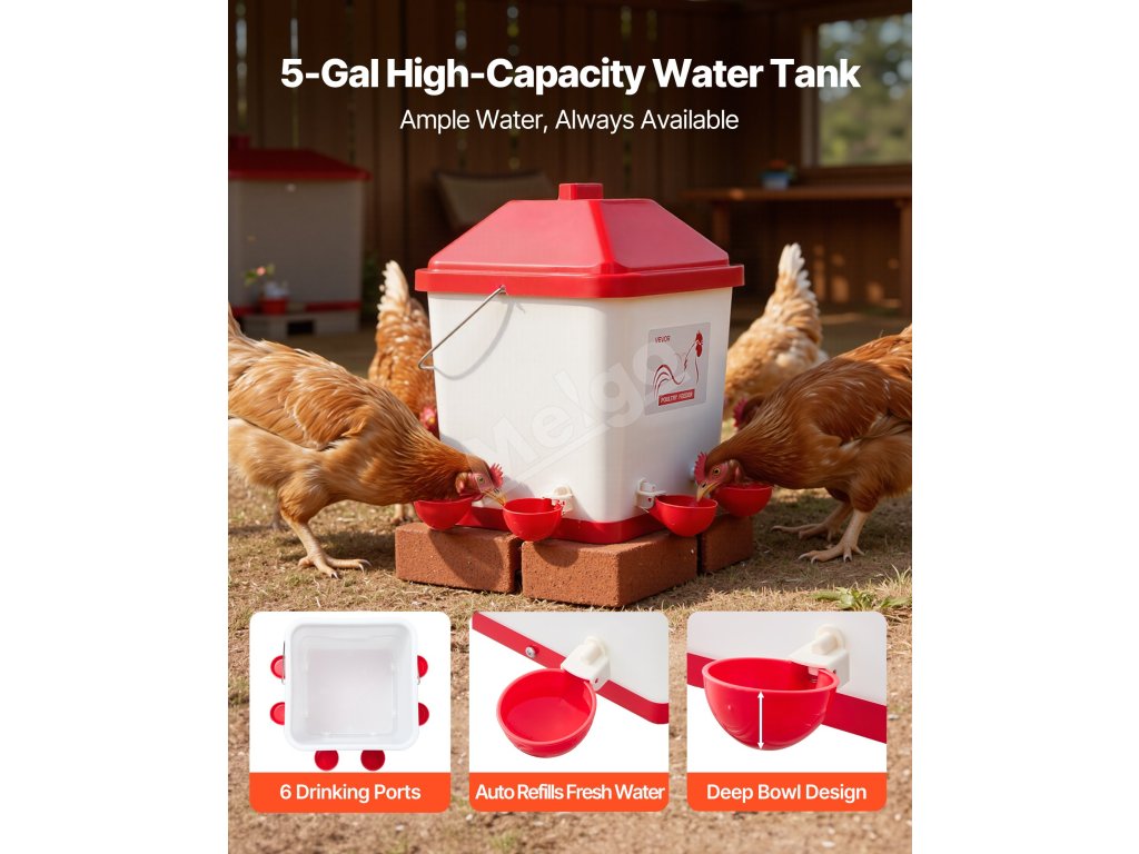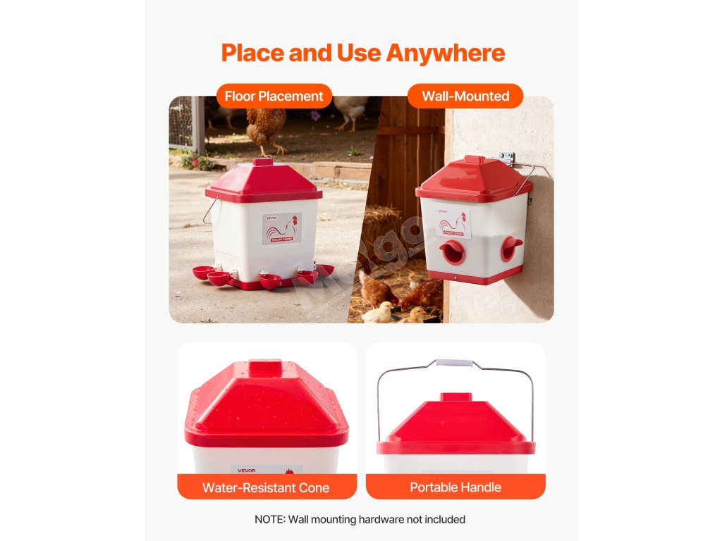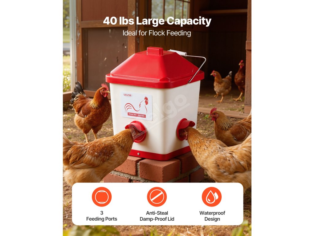 Náš kŕmidlo pre kurčatá je vybavené kŕmnymi otvormi s vlhkosti odolnými viečkami, ktoré zabraňujú veveričkám, vtákom, hlodavcom a iným zvieratám v krádeži krmiva. Pomáha znižovať straty krmiva vonku a zabezpečuje, že vaše krmivo zostane v bezpečí.