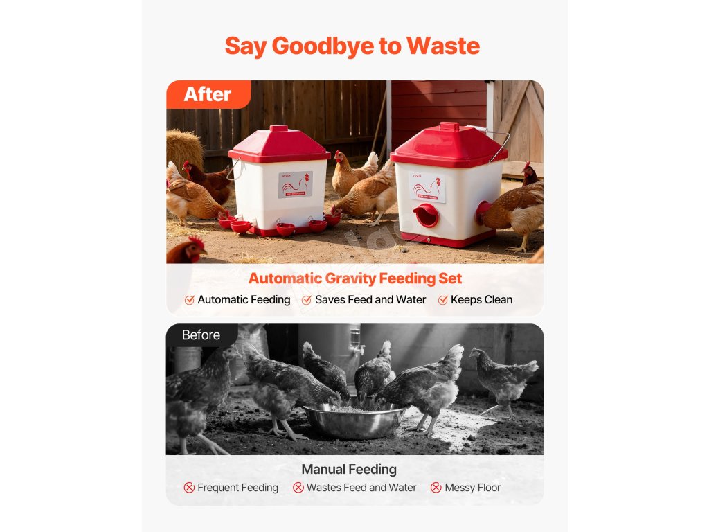 Vďaka gravitačnému napájaniu má automatický kŕmidlo pre hydinu kŕmne otvory s priemerom 2,76 palca, ktoré uľahčujú kŕmenie hydiny a zabraňujú rozsypaní krmiva, čím zostáva krmivo suché, čerstvé a bez odpadu.