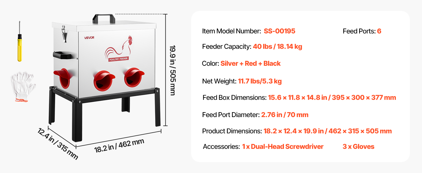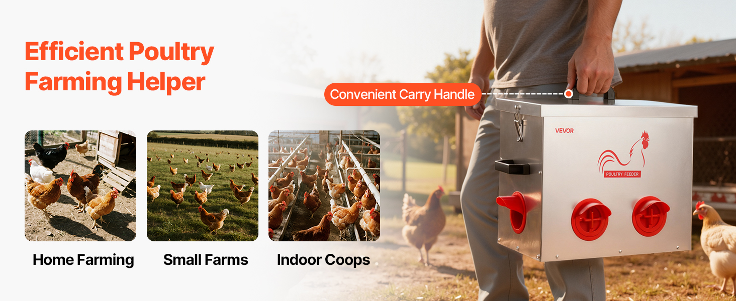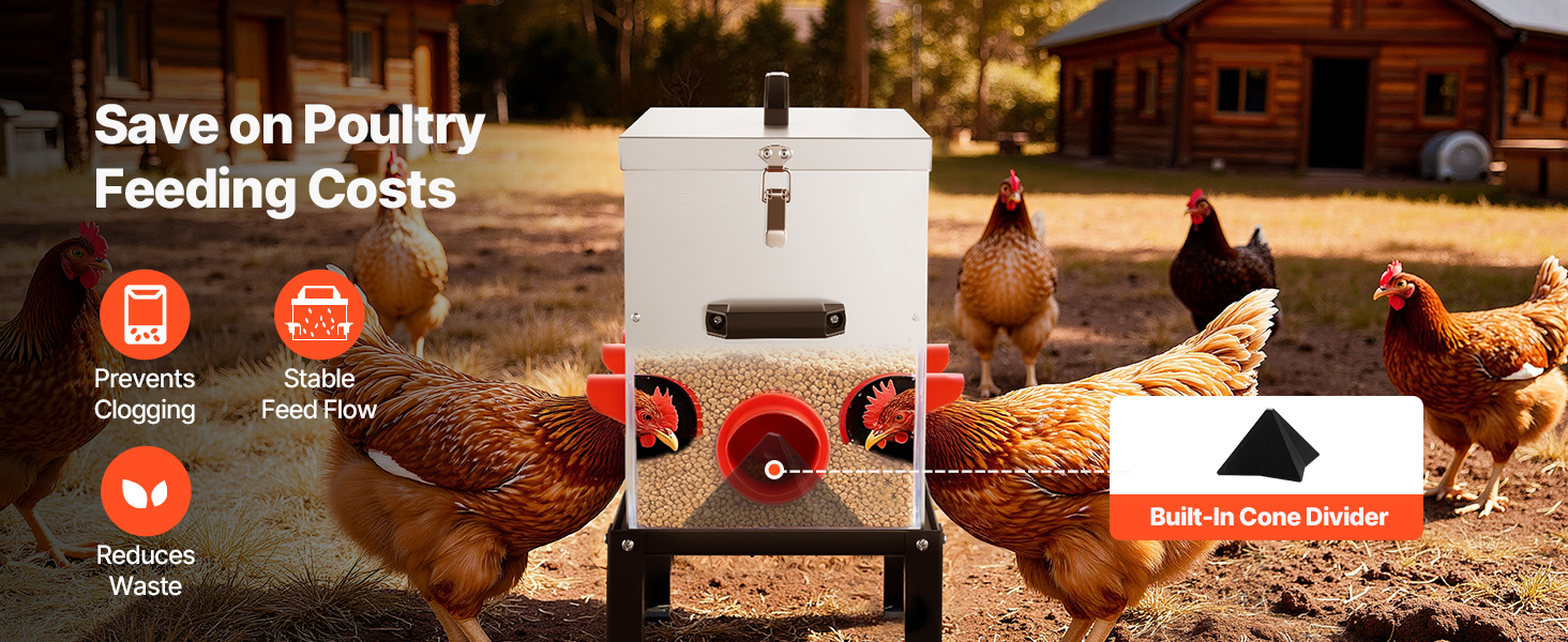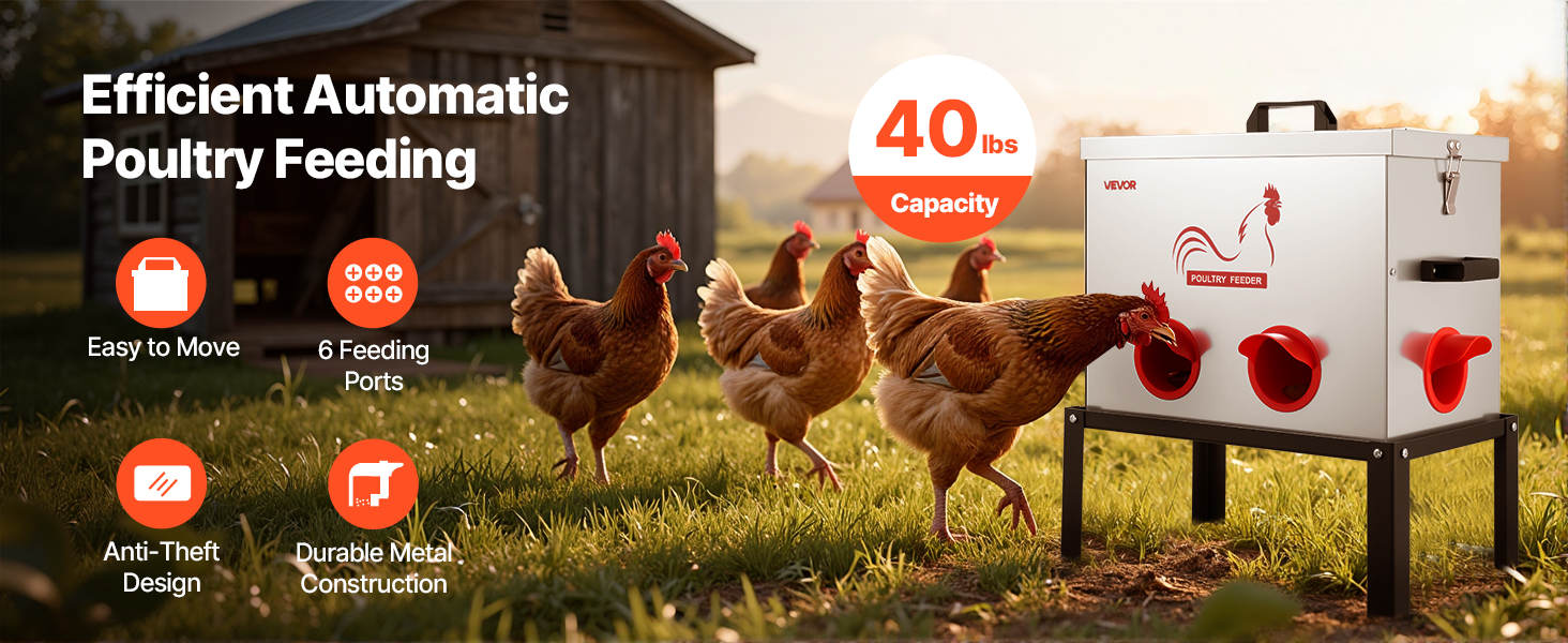 Toto kovové automatické kŕmidlo pre kurčatá s kapacitou 40 libier je vybavené šiestimi kŕmnymi otvormi, ktoré umožňujú kŕmenie viacerých kusov hydiny súčasne. Vďaka gravitačnej konštrukcii automaticky dopĺňa krmivo, čím šetrí spotrebu krmiva.
