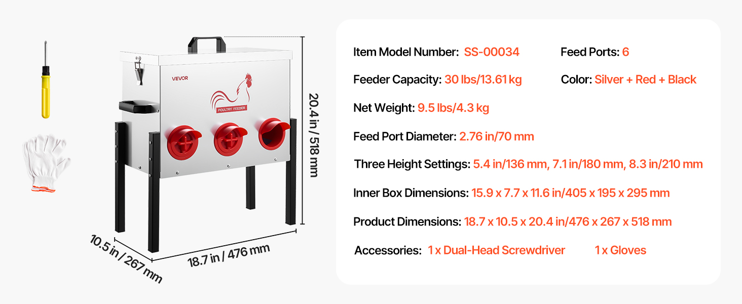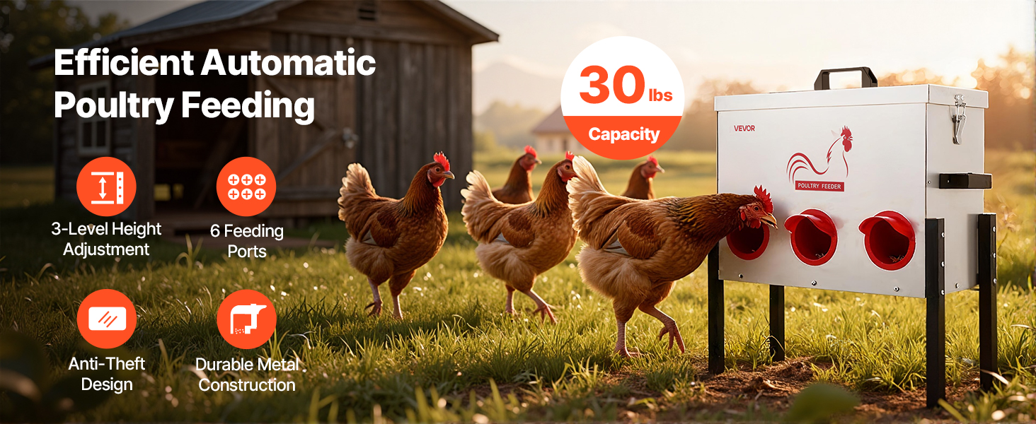 Toto kovové automatické kŕmidlo pre kurčatá s kapacitou 30 libier je vybavené šiestimi kŕmnymi otvormi, ktoré umožňujú kŕmenie viacerých kusov hydiny súčasne. Vďaka gravitačnej konštrukcii automaticky dopĺňa krmivo, čím šetrí spotrebu krmiva.