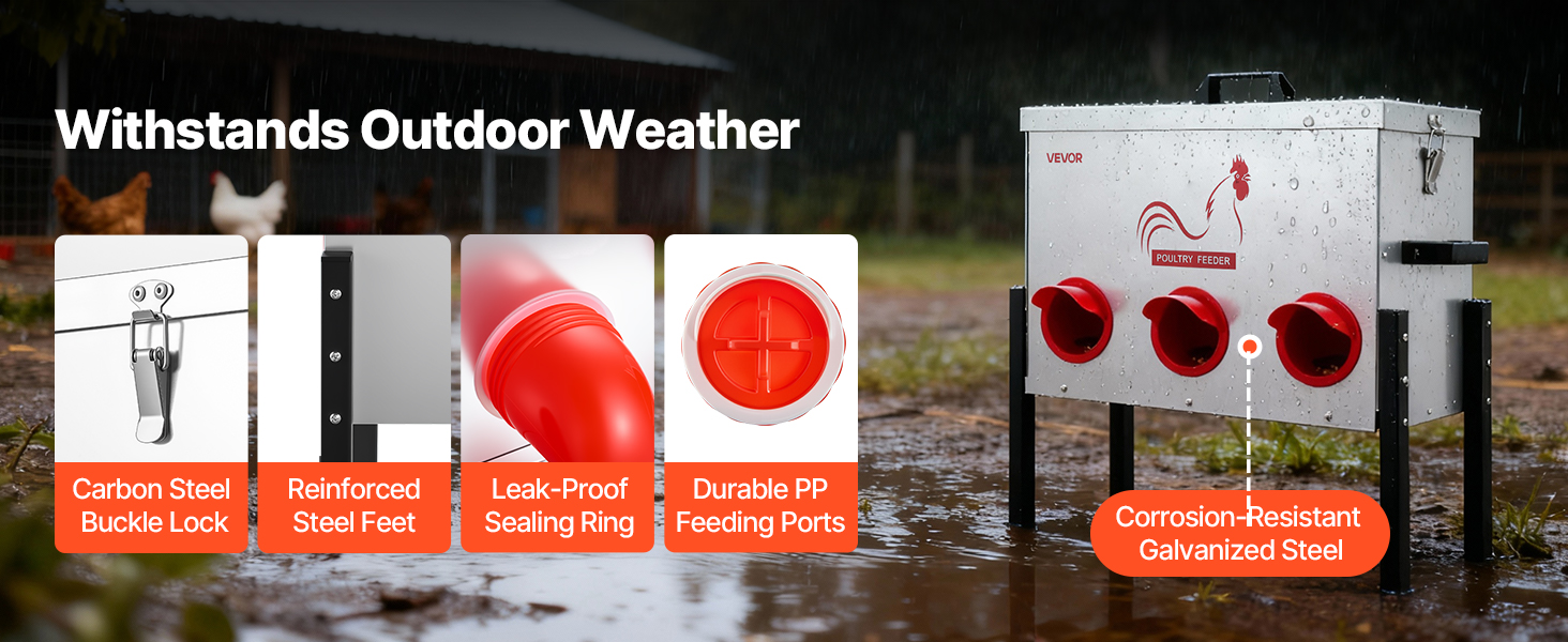 Naše automatické kŕmidlo pre kurčatá je vyrobené z kvalitnej pozinkovanej ocele a PP materiálov a odoláva korózii a hrdzi aj pri dlhodobom používaní vonku. Je vybavené tesniacim krúžkom odolným proti vlhkosti, vďaka čomu udrží vaše krmivo suché a čerstvé, čím zaručuje jeho trvanlivosť a spoľahlivosť.