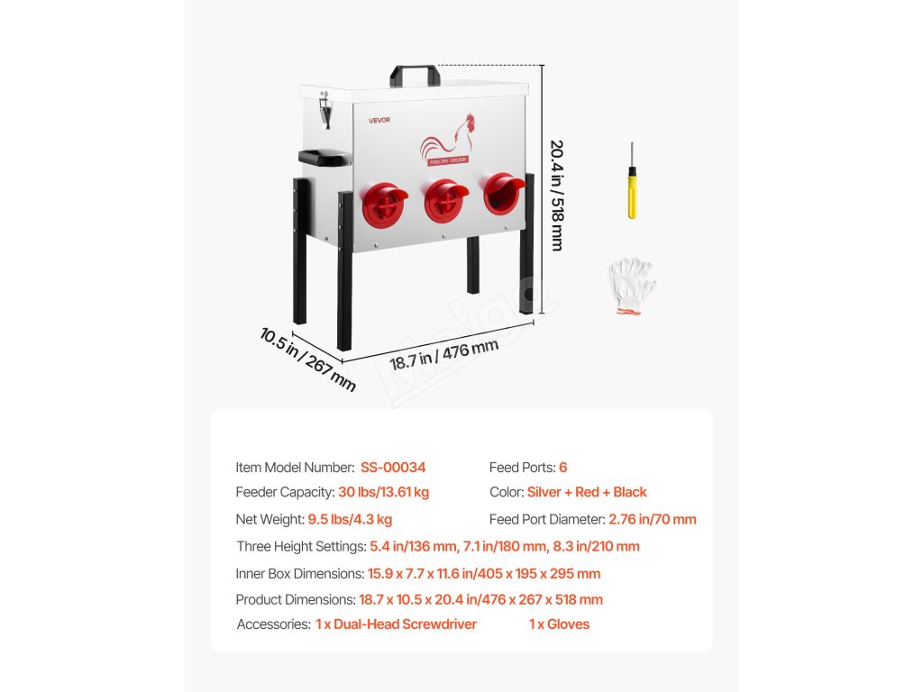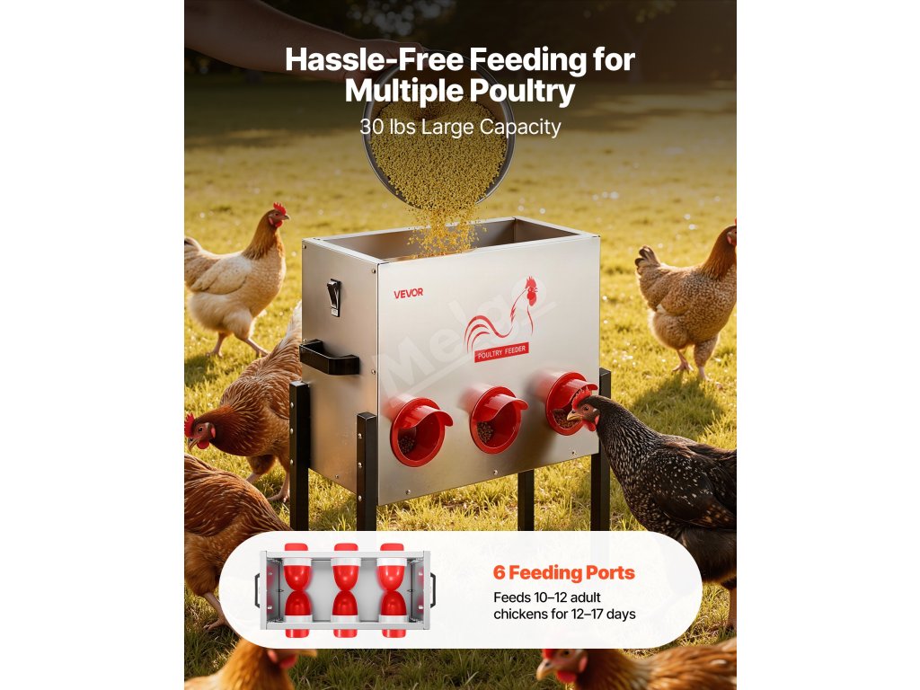 Toto kovové automatické kŕmidlo pre kurčatá s kapacitou 30 libier je vybavené šiestimi kŕmnymi otvormi, ktoré umožňujú kŕmenie viacerých kusov hydiny súčasne. Vďaka gravitačnej konštrukcii automaticky dopĺňa krmivo, čím šetrí spotrebu krmiva.
