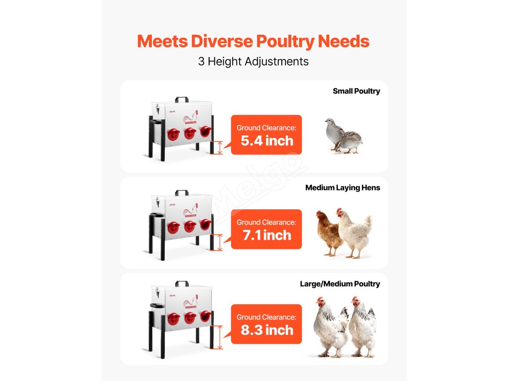 Stojan automatického kŕmidla pre hydinu poskytuje tri nastavenia výšky od 5,4 do 8,3 palca, vďaka čomu ho môžete ľahko prispôsobiť rôznym veľkostiam hydiny. Vhodné na kŕmenie malých až stredne veľkých vtákov na dlhodobé a pohodlné používanie.