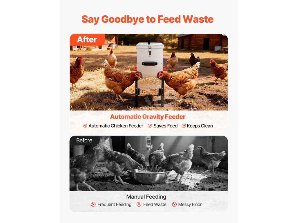 Naše kŕmidlo pre kurčatá sa dodáva s kŕmnymi otvormi s krytmi odolnými proti vlhkosti, ktoré bránia veveričkám, vtákom, hlodavcom a iným zvieratám v krádeži krmiva. Pomáha znižovať straty krmiva vo vonkajšom prostredí a zabezpečuje, aby krmivo zostalo v bezpečí.
