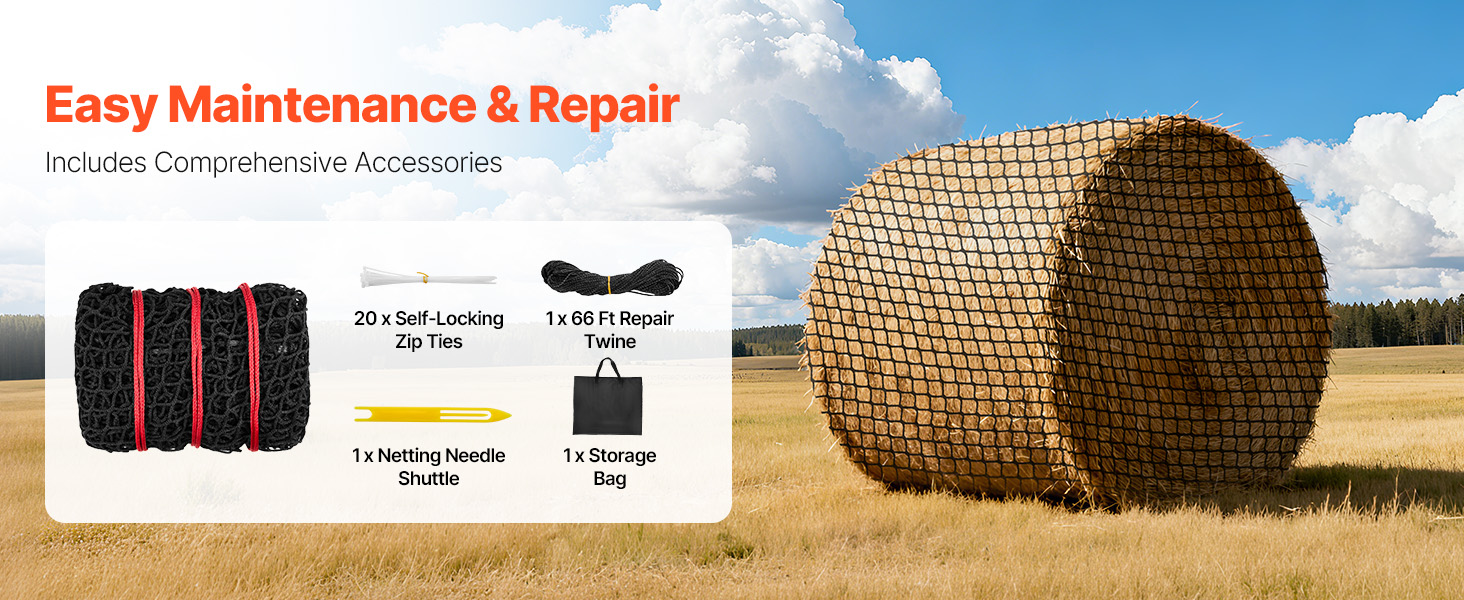 Táto sieť na balíky sena umožňuje rýchlu opravu a čiastočnú výmenu vďaka priloženému príslušenstvu na opravu. Umožňuje jednoduchú údržbu a predlžuje životnosť, čím znižuje náklady na výmenu pre dlhodobé a nákladovo efektívne používanie.