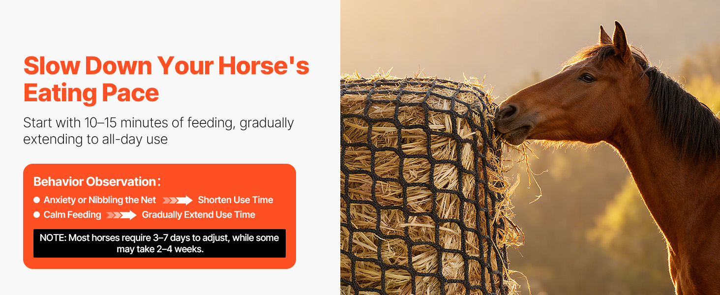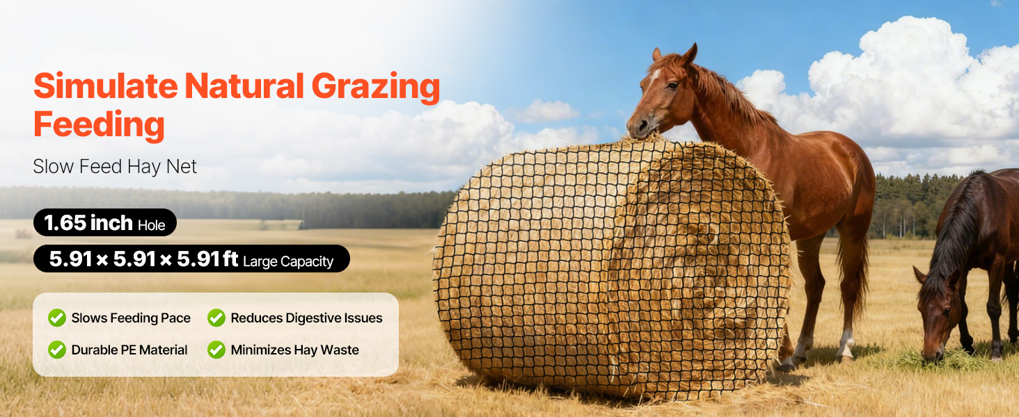 Naša sieťka na seno s okrúhlymi balíkmi s pomalým kŕmením využíva postupný spôsob kŕmenia, ktorý pomáha koňom vytvoriť si pozitívne návyky pri kŕmení a znižuje úzkosť a odpor. Odporuje stereotypnému správaniu a podporuje trávenie pre efektívne dlhodobé kŕmenie.