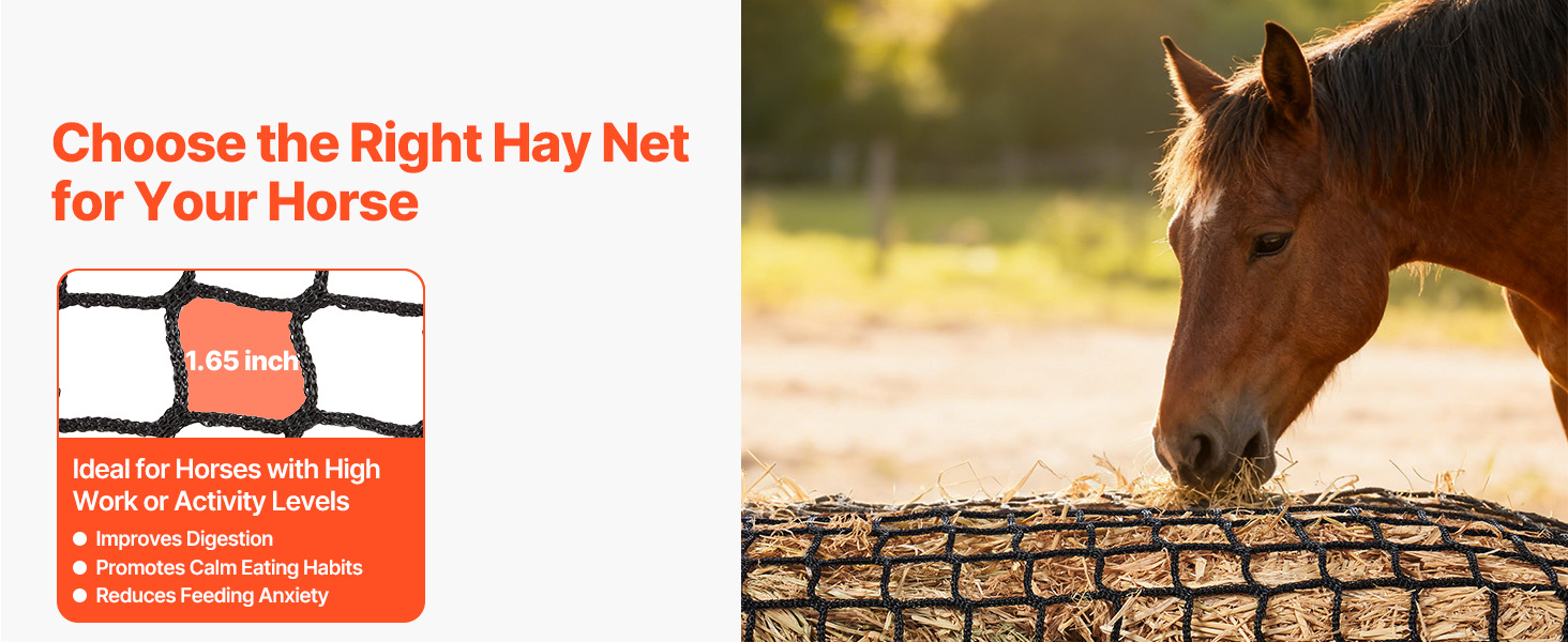 Táto sieť na okrúhle balíky s priemerom 1,65 palca je určená pre vysokoenergetické a aktívne kone. Kontroluje tempo kŕmenia a zároveň zabezpečuje dostatočný príjem sena na pokrytie energetických potrieb po intenzívnom tréningu alebo práci.