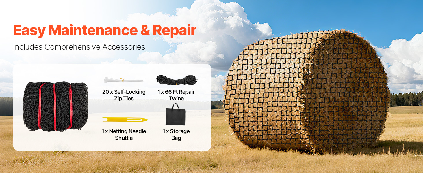 Táto sieť na balíky sena umožňuje rýchlu opravu a čiastočnú výmenu vďaka priloženému príslušenstvu na opravu. Umožňuje jednoduchú údržbu a predlžuje životnosť, čím znižuje náklady na výmenu pre dlhodobé a nákladovo efektívne používanie.