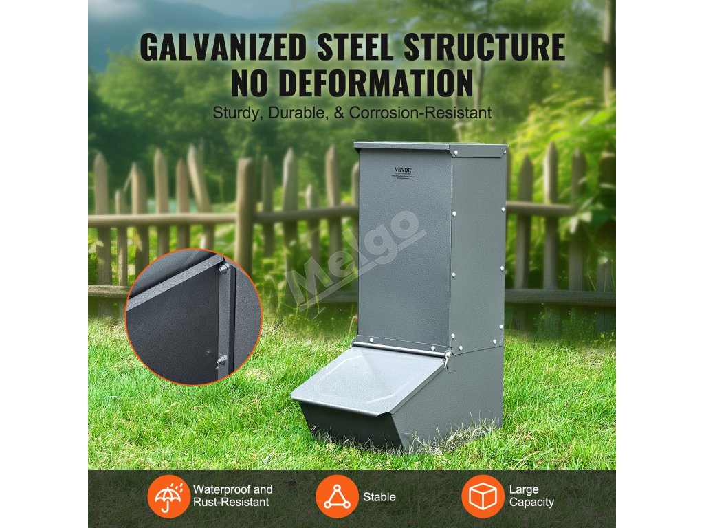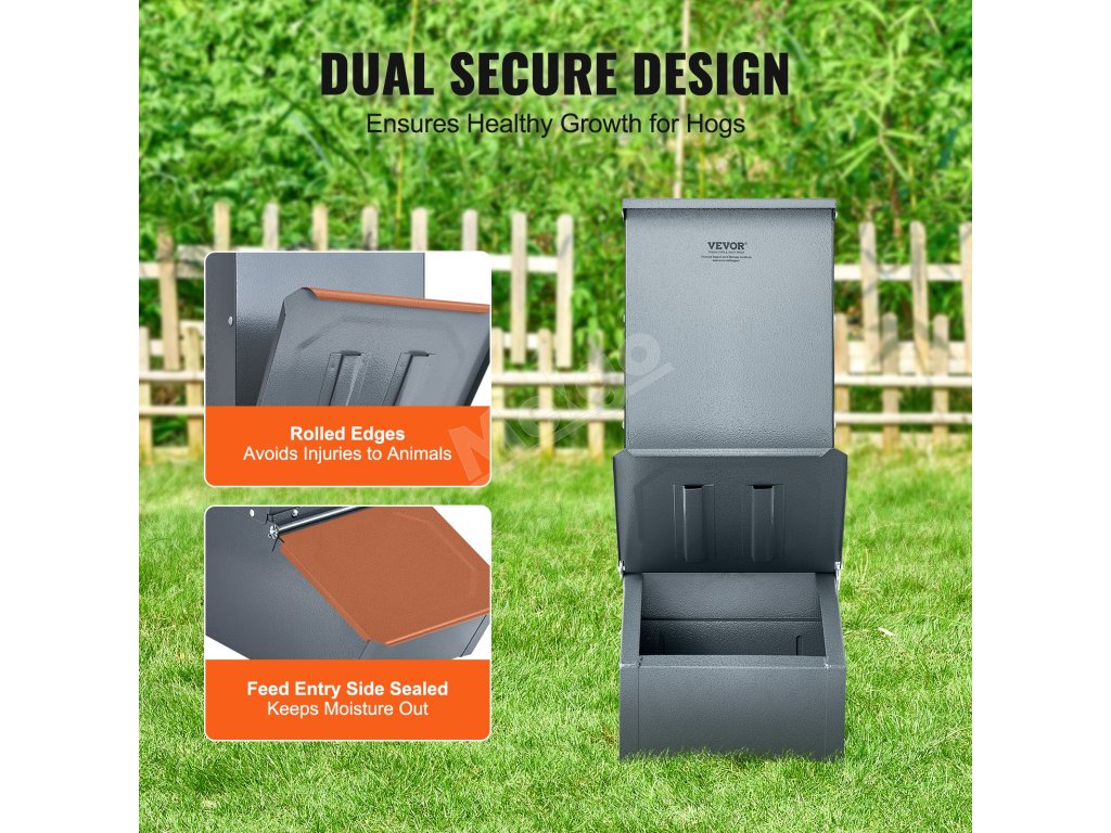 Toto kŕmidlo pre ošípané je špeciálne vybavené dverami s konštrukciou odolnou proti dažďu, aby krmivo zostalo suché vo vlhkých poveternostných podmienkach. Táto konštrukcia nielenže zlepšuje uchovávanie krmiva, ale tiež znižuje množstvo odpadu, čím vám poskytuje väčší pokoj pri každodennom riadení kŕmenia.